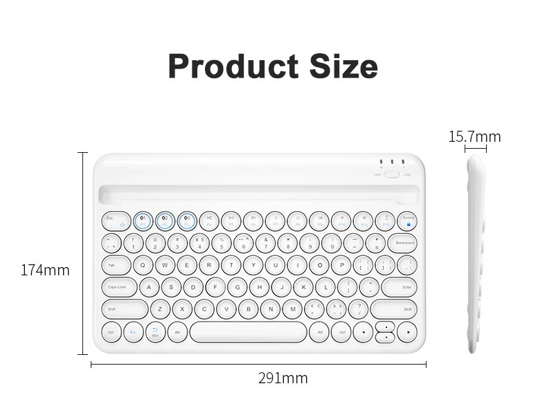 SpecificationColor: Pink/White/BlackPower: RechargeableKeyboard size: 291x174x15.7mmConnect way: BluetoothTransmission Distance: 8m Package
