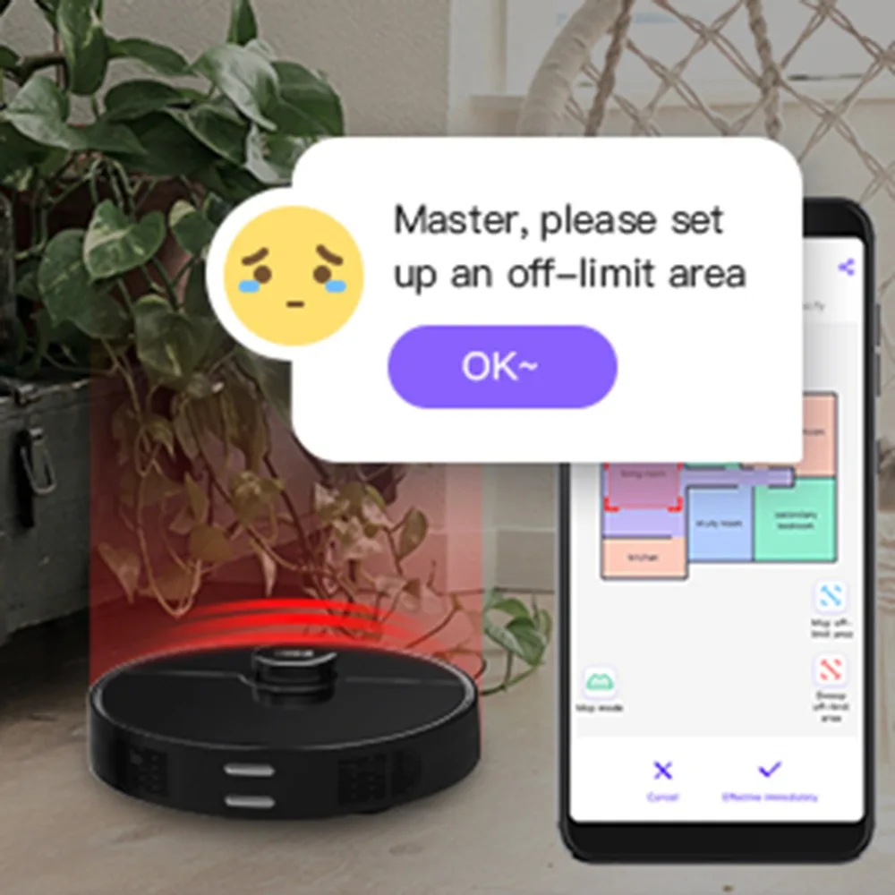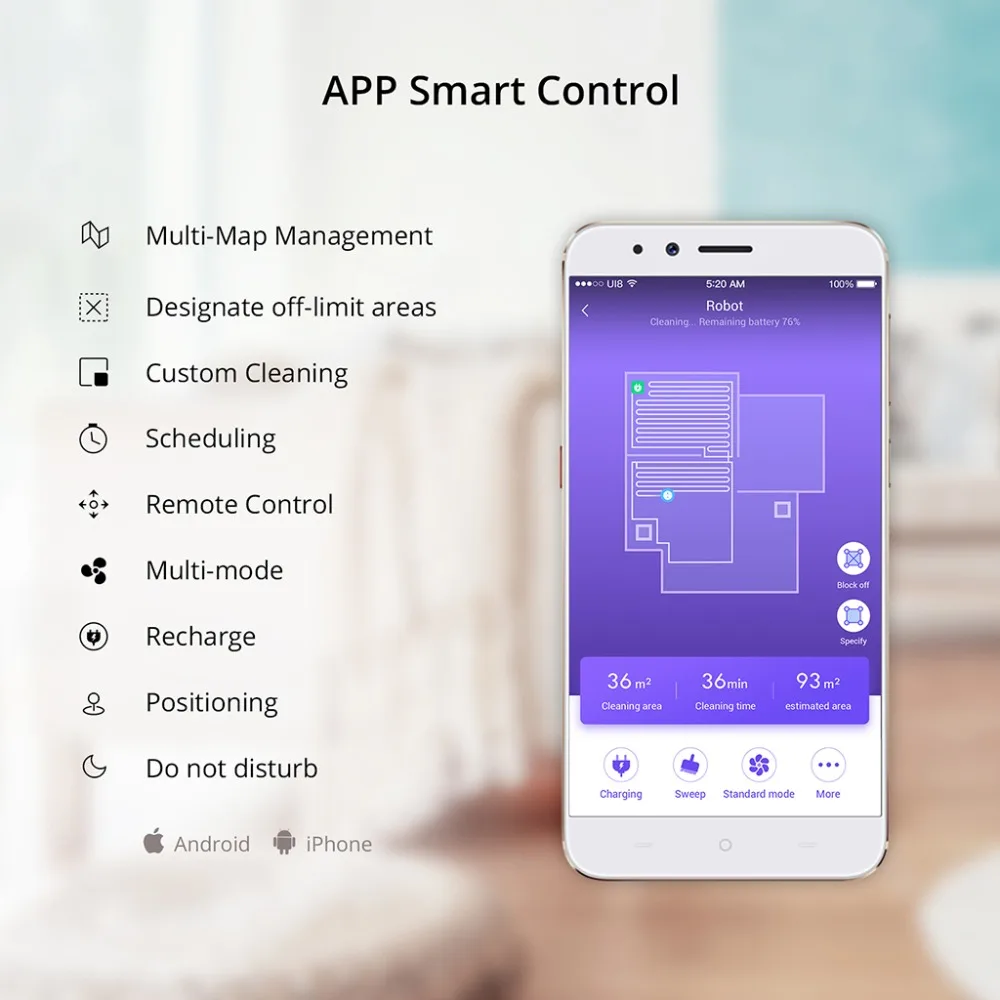 APP control available, get the status of cleaning progress in time, and Set off-limit areas and customized cleaning through your mobile phone