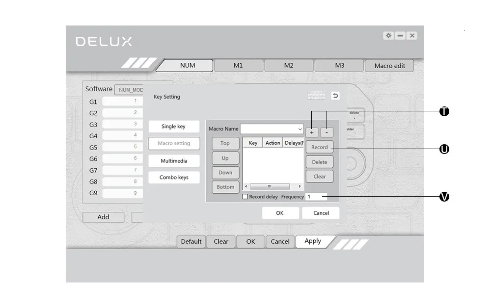 7. Macro: Click "Record" and add action on the window, click + or - to add new qction or delete action. Record delay and record cycles can be set.