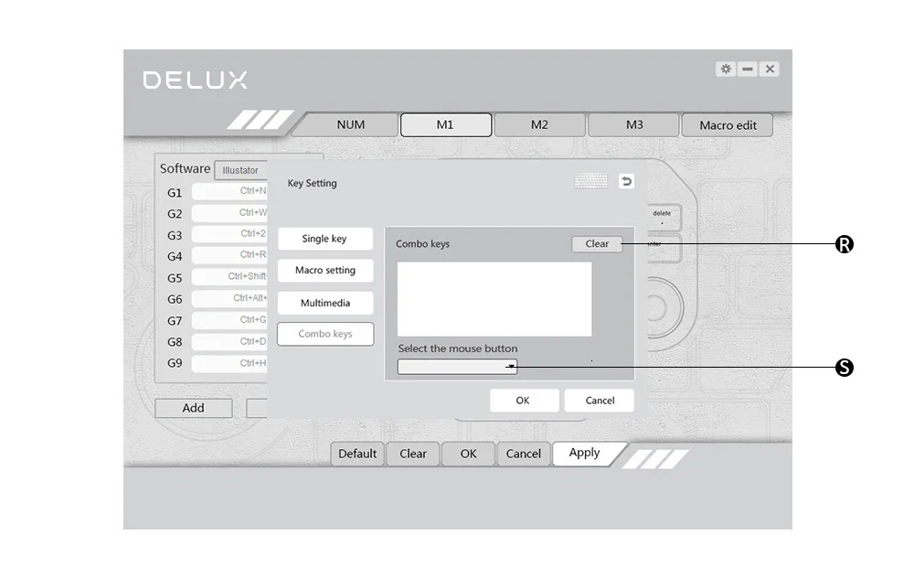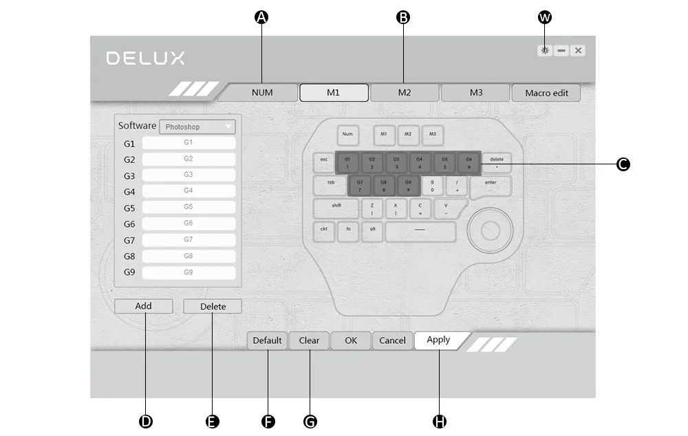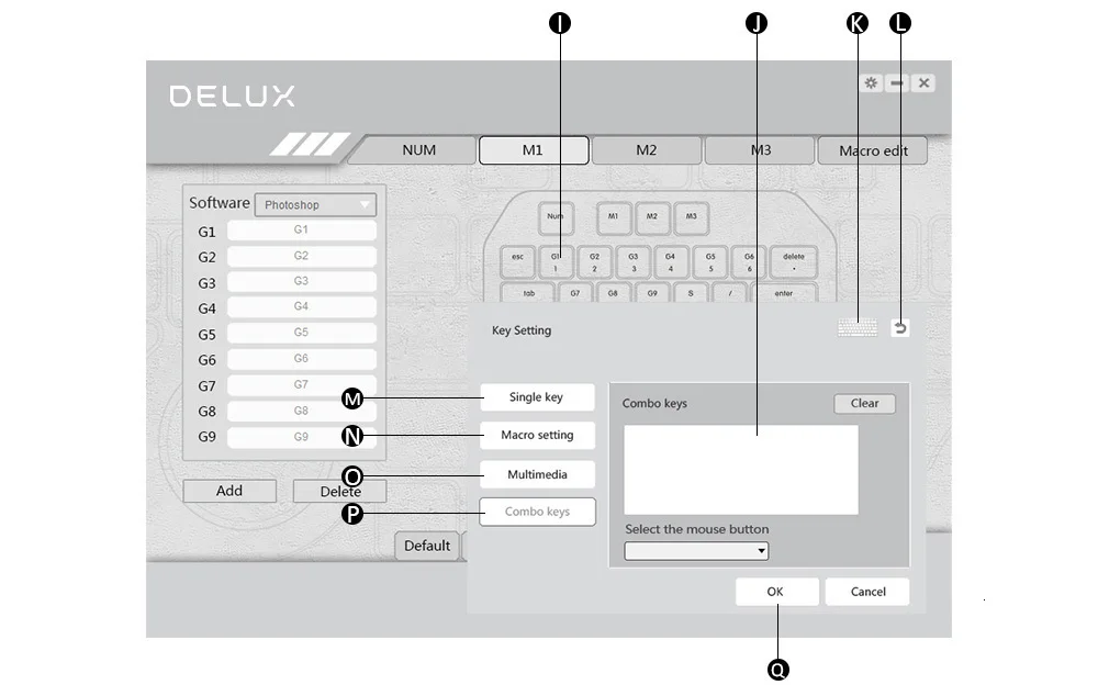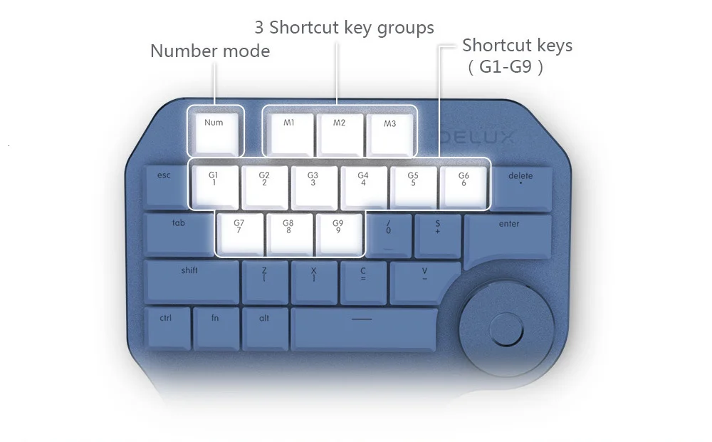 - Three groups of(M1/M2/M3)shortcut keys by driver, Each group has 9 (G1-G9) shortcut keys for mainstream design software