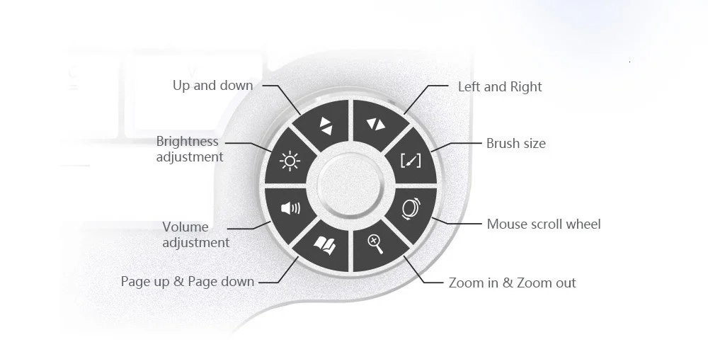 Multi-functional dial has functions like turn up and down, turn left and right, zoom in, zoom out, page up, page down,