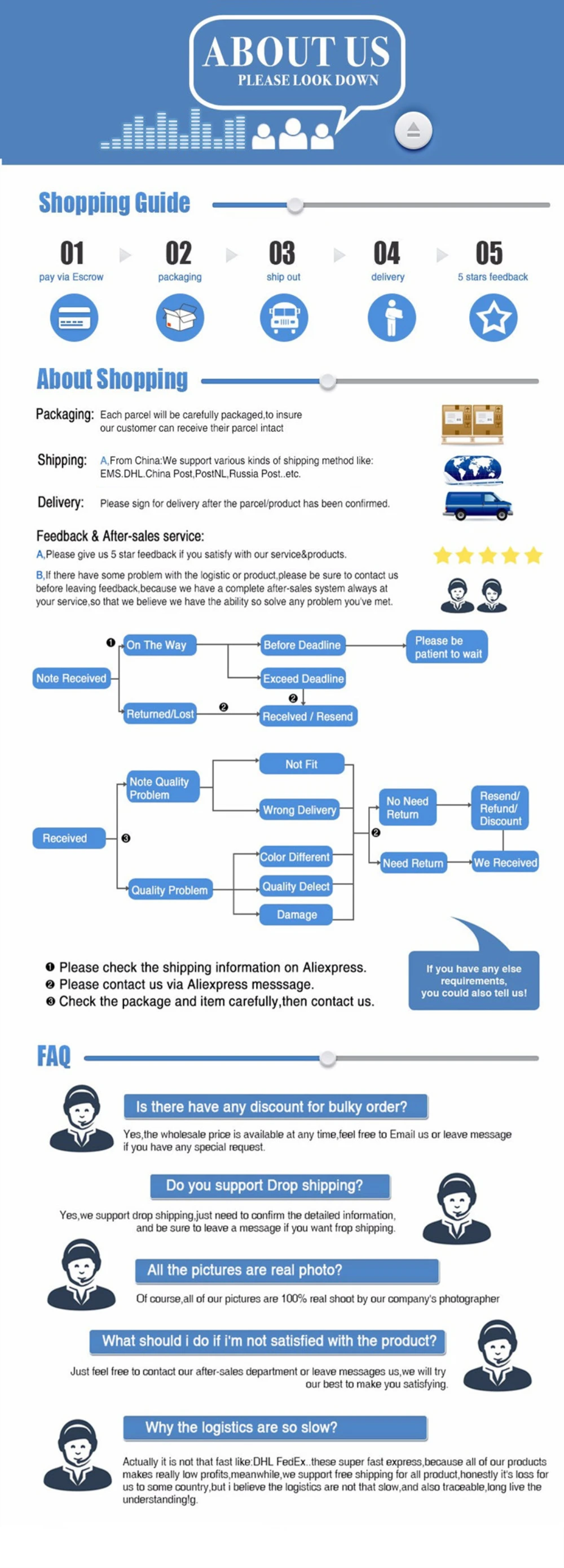 FAQ:Q: About ProductA: The brand products sold are 100% brand new authentic.We will be fully tested before shipment. All photos displayed are all taken in kind.Q: About Shipping & Delivery TimeA: After your payment is successful, we will ship within 24 hours, except for holidays and promotion periods.The logistics provider is a third party, and the specific transportation speed depends on the efficiency of the local postal service,therefore we can't assure exact time of delivery,90% of countries,The approximate time range is 25-45 days.If you have not received the package for more than 45 days, please contact us. We will track the shipment and get back to you as soon as possible with a reply.Q: About after sales serviceA: We regard customers as our friends , we hope you can shop from us with more happiness and less worry.If you have problem when using our products, please contact us, we will try best to help you to solve it.Our goal is customer satisfaction!Q: About FeedbackA: We maintain high standards of excellence and strive for 100% customer satisfaction!Your feedback it is really important for us,if you like our product and service, hope can leave us a great feedback, Please don't forget to leave us positive feedback. Then you can get our thanks by contacting our customer service.Q: I am a reseller. I would like to buy many pieces of your item, what's the wholesale price?A: If you would like to buy large quantity, please send message to us, we will give you the best price!Q: Do you support dropshipping?A: Yes,We support dropshipping.Q: Can I change my name/address/phone or change other products at the same price?A: We can provide this service before shipping, Please contact us directly to change or replace. But we do not offer this service during all the big promotion.Pls double check your orders before making the payment.
