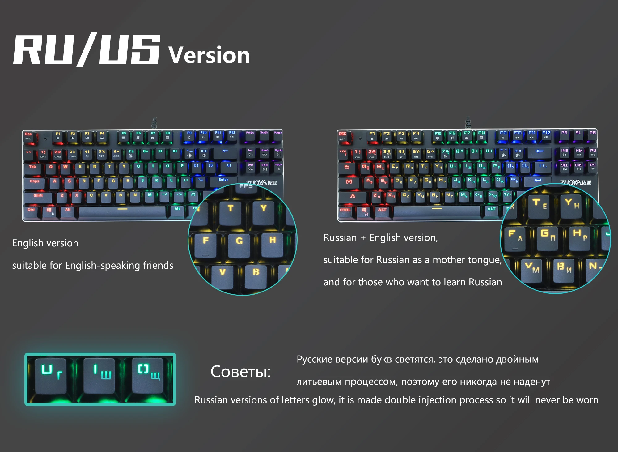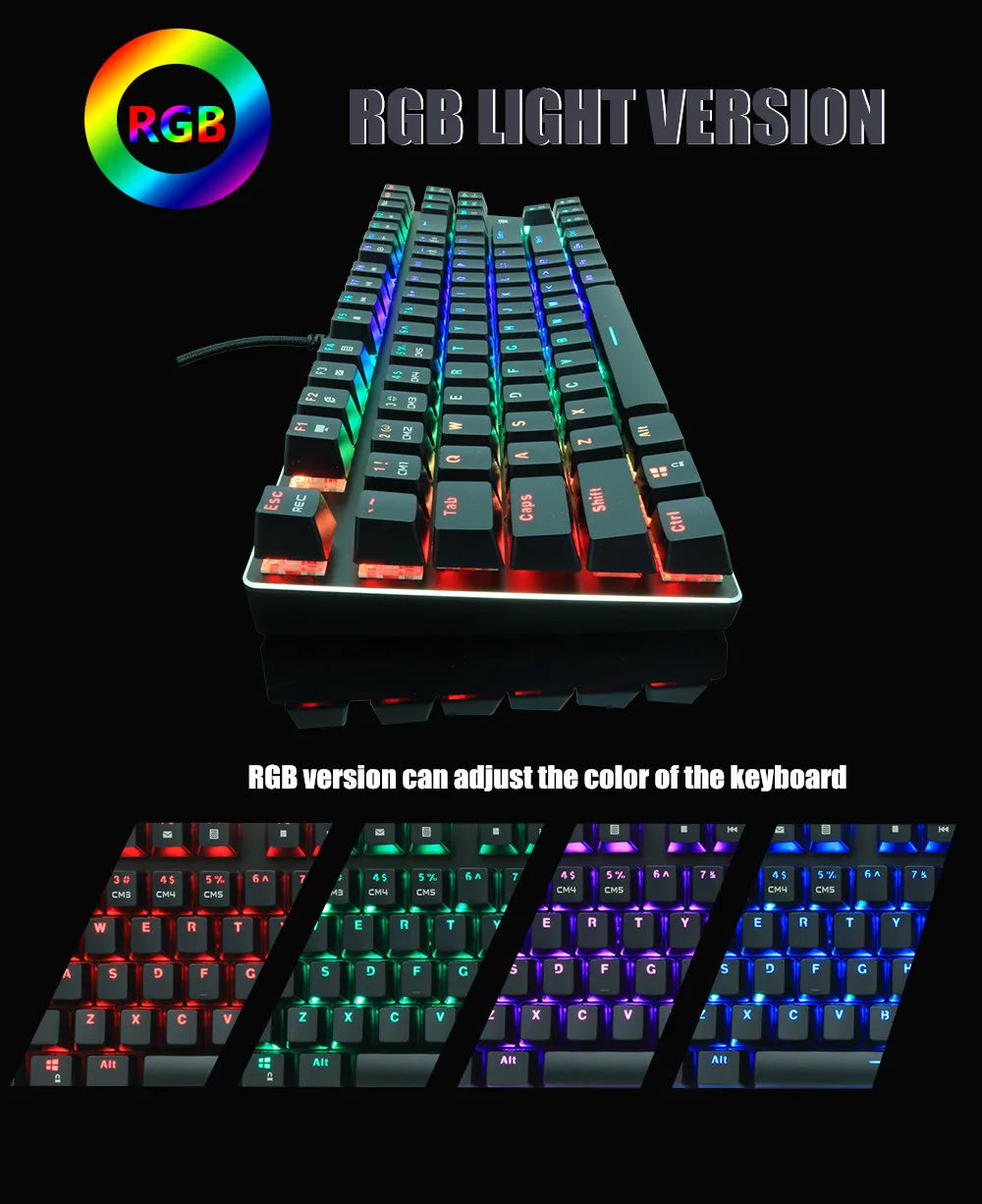 Red switch = light version of the black switch (its press force is less than the black switch)\\Gaming Mechanical keyboard usb wired Backlit Anti-ghosting 87 key RGB Russian Blue Red Switch keyboard for computer gamer laptop//Please note: