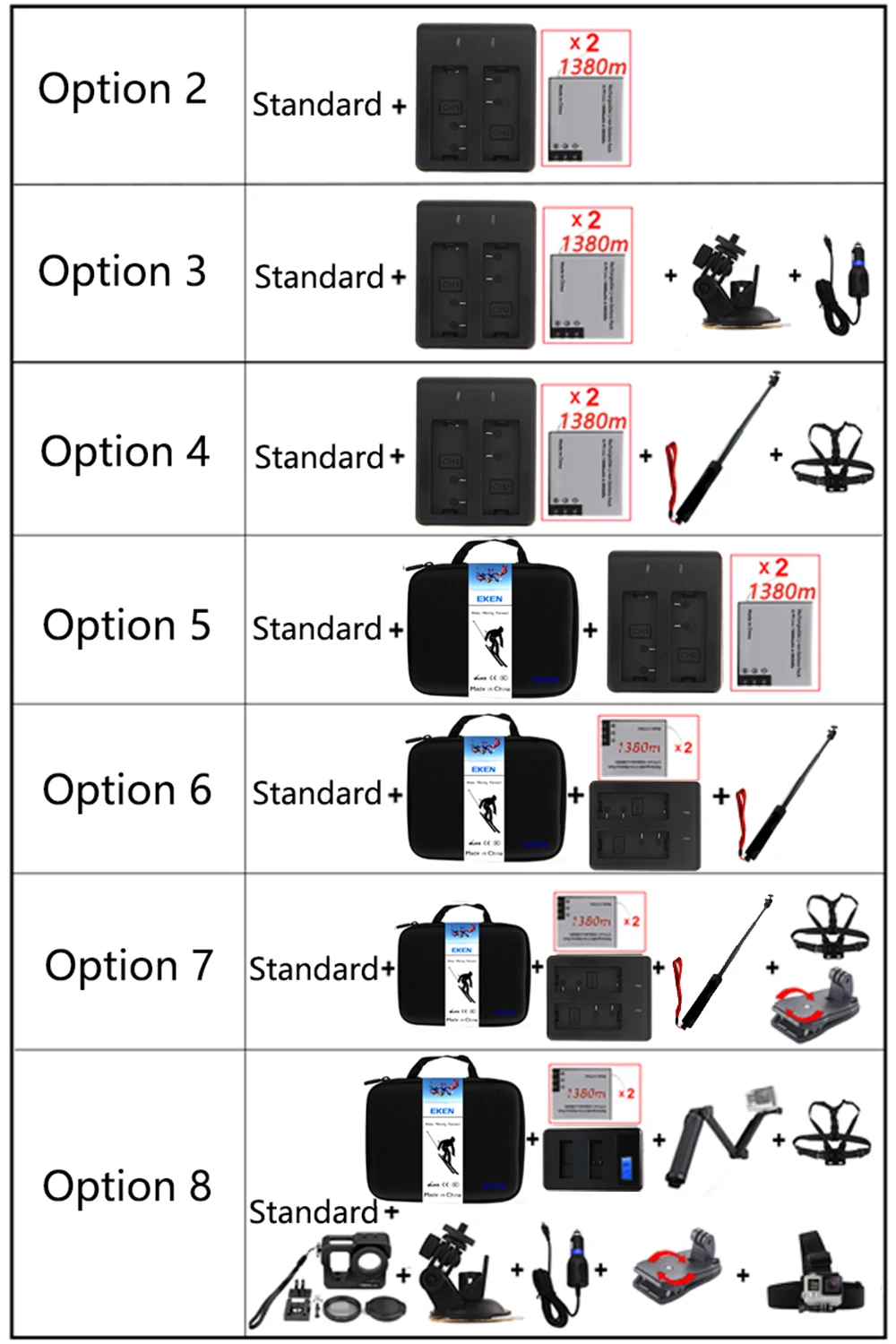 Option 3: Standard + Extra TUYU 1380mAh Battery*2 + Battery Charger + Car charger + suction cup + Aluminium alloy protective frame + Suction cup Holder + Car charger + Head Strap
