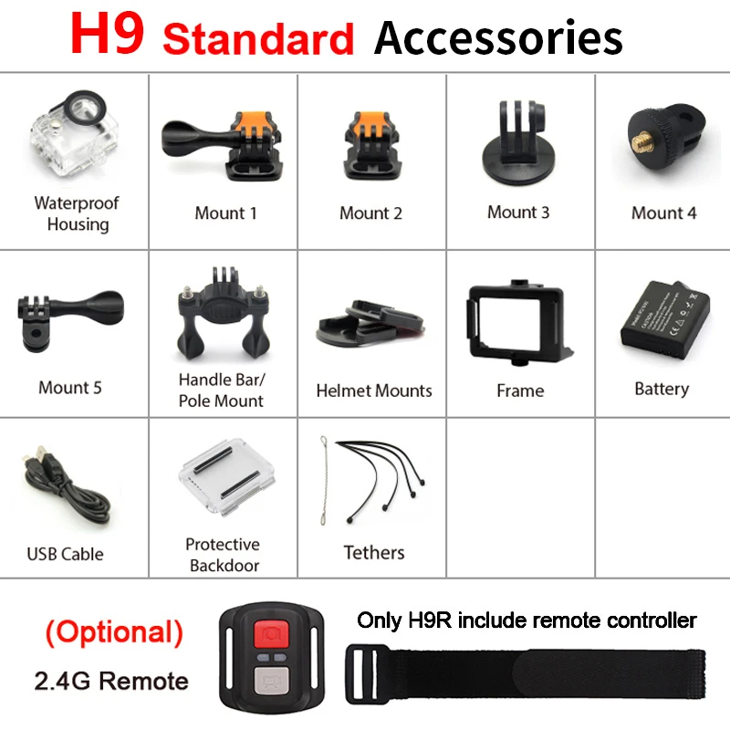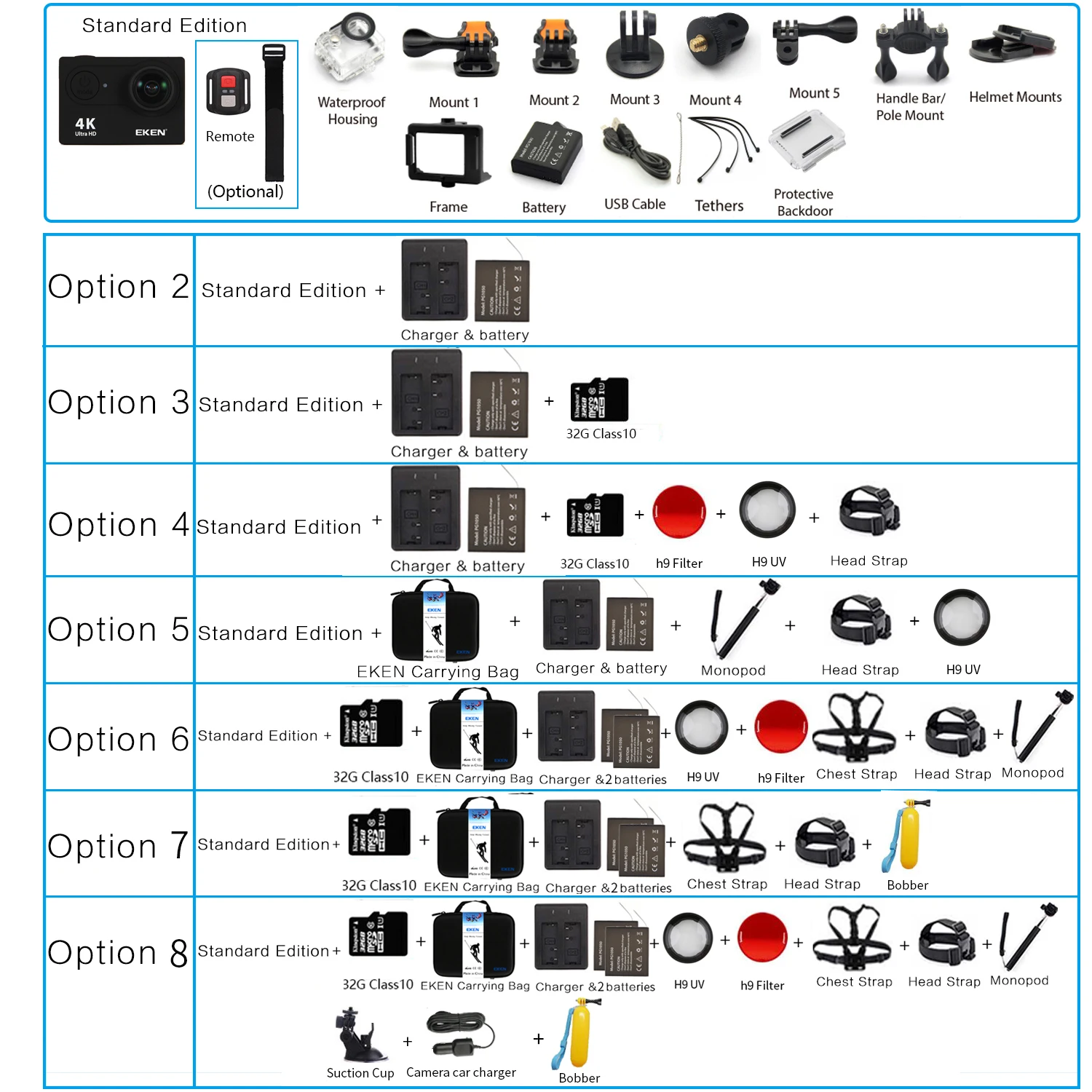 Standard : 1) Standard A. H9 /H9r Camera + Standard Accessories set as photo show Standard B : H9/H9R waterproof housing kits: Camera + waterproof housing (no other standard accessory)Option 2 : Extra battery + Dual Charger Option 3 : Extra battery + Dual Charger + 32GB class 10 Card Option 4 : Extra battery + Dual Charger + 32G Class 10 SD Card + Head Strap + H9 Filter + H9 UV Select 5 : EKEN Carrying Bag + Extra battery + Dual Charger + Monopod + Head Strap + h9 UV Select 6 : EKEN Carrying Bag + 2pcs Extra batteries + Dual Charger + Monopod + Head Strap + h9 UV + h9 filter + Chest Strap + 32G Class10 SD CardSelect 7 : 2 Extra batteries + Dual Charger + Head Strap +Chest strap + Buoyancy rod + 32GB class 10 Card + EKEN Carrying bag Select 8 : 2 Extra batteries + Dual Charger + Head Strap +Chest strap + Buoyancy rod + 32GB class 10 Card + EKEN Carrying bag + H9 UV + H9 Filter + Monopod + Car Charger + Suction cup Notice: