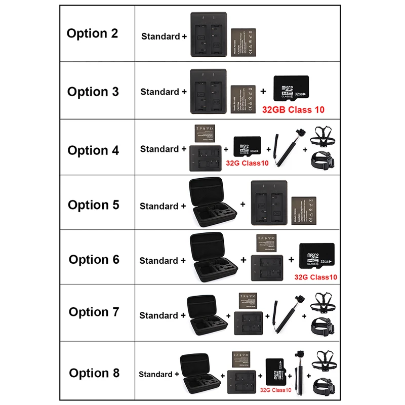 H9 Camera + Accessories (set as photo shown)H9R Camera + Remote + Accessories (set as photo shown)Option 2: Standard + Extra Original Battery + Battery ChargerOption 3: Standard + Extra Original Battery + Battery Charger + 32GB class 10 memory CardOption 4: Standard + Extra Original Battery + Battery Charger + 32GB class 10 memory Card + Monopod + Chest strap + Head strapOption 5: Standard + Portable Bag + Extra Original Battery + Battery ChargerOption 6: Standard + Portable Bag + Extra Original Battery + Battery Charger + 32GB class 10 memory CardOption 7: Standard + Portable Bag + Extra Original Battery + Battery Charger + Monopod + Chest strap + Head strapOption 8: Standard + Portable Bag + Extra Original Battery + Battery Charger + 32GB class 10 memory Card + Monopod + Chest strap + Head strap1, About Russian, Spain and Poland warehouse? The price is much lower than the local supplierperfect insurance, every one quality goodsRussia's regions Provide about 2 - 15 business daysSpanish region Provide about 1 - 3 business daysEuropean countries Provide about 3 - 10 business days2, H9 does not include remote controller, H9R include a remote controller.3, It only can be used with good brand C10 TF card, if not, it can't be setted to 4K and 1080P 60fps.4, if you buy option 5,6,7,8 contains collection bag , camera and accessories shall be put into collection bag.Product Information:See your world through 4K
