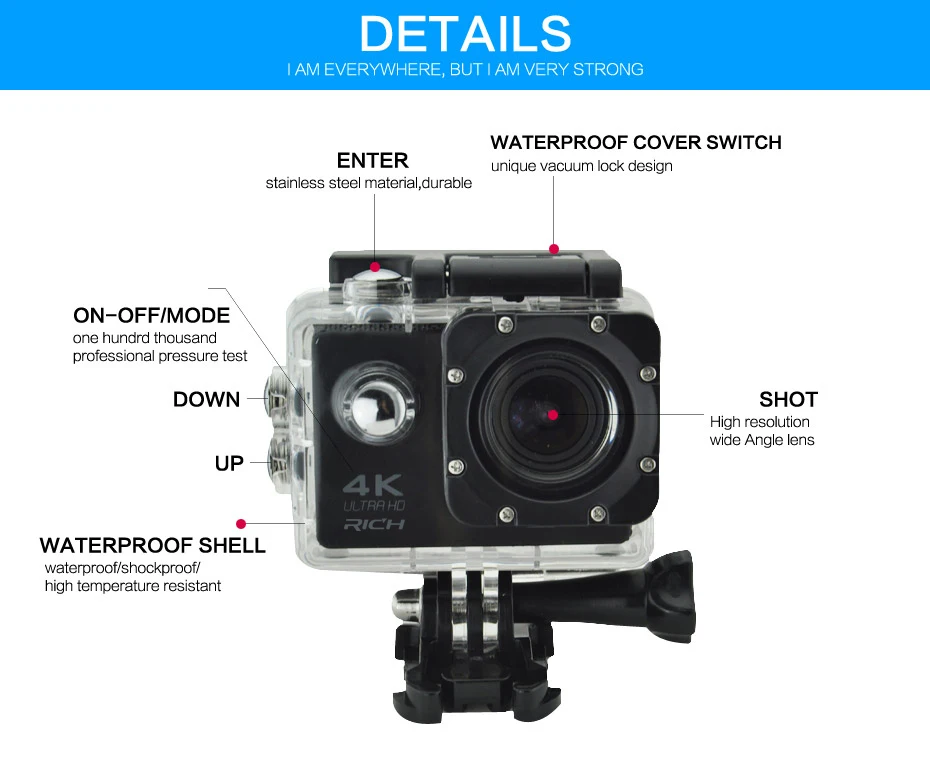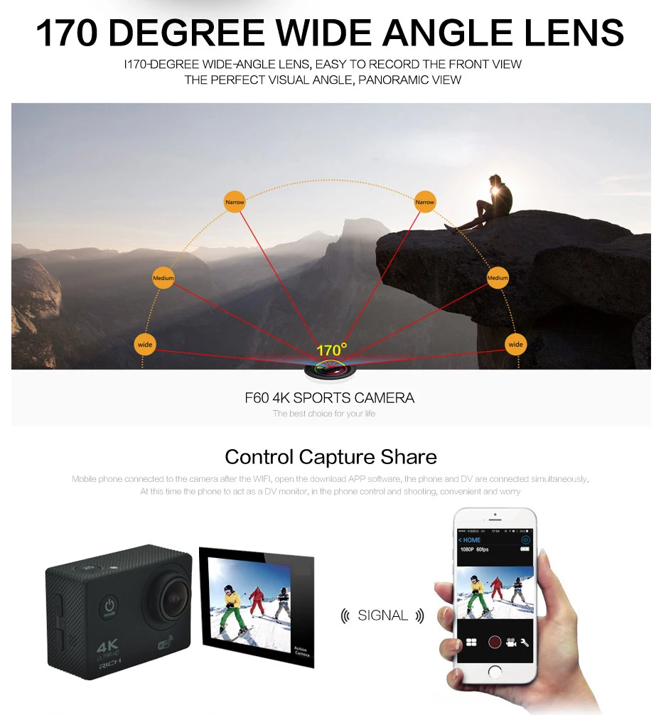 The best product you are looking for is "RICH Action camera F60 / F60R Ultra HD 4K / 30fps WiFi 2.0 170D go Helmet Cam pro underwater waterproof Sport camera". This product is available and ready to be purchased. Get attractive discounts every time you shop in our store (aliexpress.com). Aliexpress also provides a coupon of $ 3 for the first buyer to shop there. don't forget to bookmark our store page so you can go shopping again anytime..