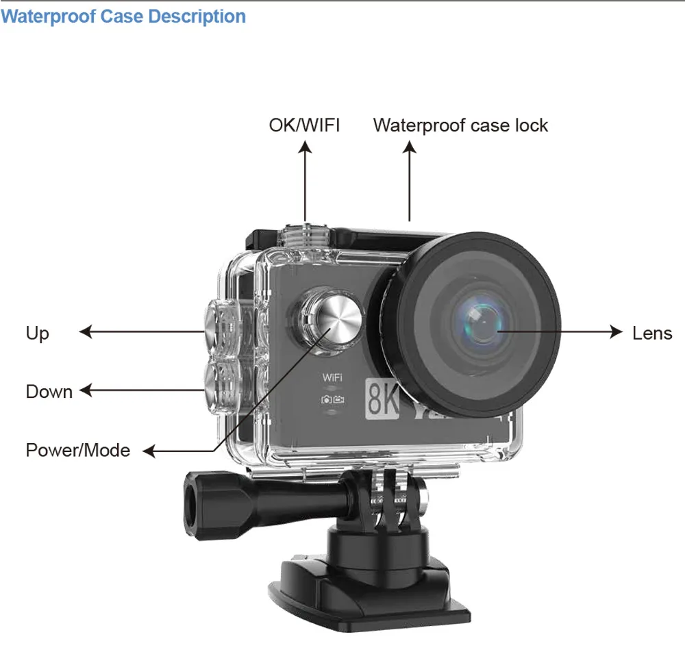 Waterproof Housing: Please test the housing by placing it in water before diving.Waterproof Backdoor: Supports up to 40m waterproof level.Additional Skeleton Backdoor: Not waterproof, enables enhanced audio capture during activities.Option accessories: