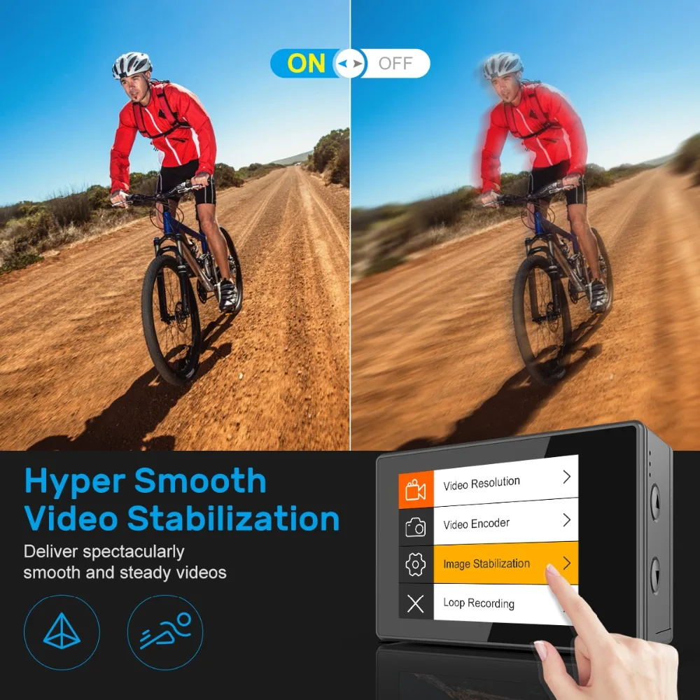 Electronic Image Stabilization: Built-in smart gyroscope and EIS for image stabilization makes it easy to catch every move for more stable and smooth videos, suitable for cycling, skateboarding, surfing and other extreme sports.