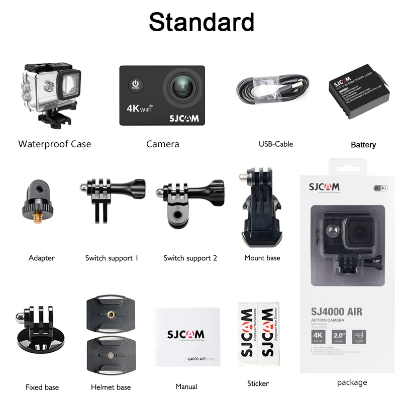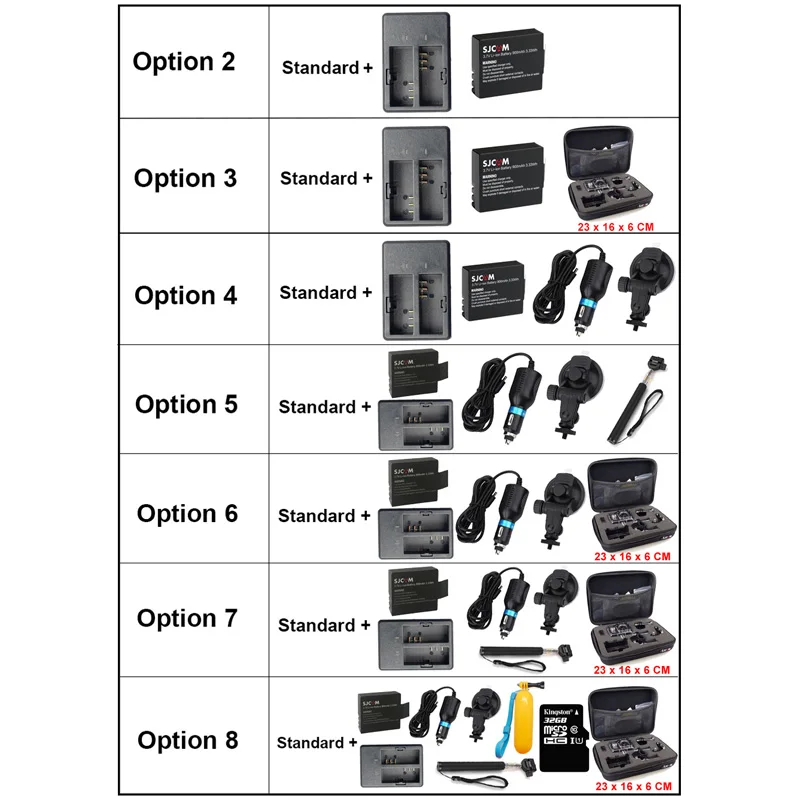 Standard: SJ4000 AIR Camera + Accessories (set as photo shown);Option 2: Standard + Extra 1pcs battery + Dual charger;Option 3: Standard + Extra 1pcs battery + Dual charger + Carry bag (size: 23 x 16 x 6 cm);Option 4: Standard + Extra 1pcs battery + Dual charger + Car charger + Car holder;Option 5: Standard + Extra 1pcs battery + Dual charger + Car charger + Car holder + Monopod;Option 6: Standard + Extra 1pcs battery + Dual charger + Car charger + Car holder + Carry bag (size: 23 x 16 x 6 cm);Option 7: Standard + Extra 1pcs battery + Dual charger + Car charger + Car holder + Monopod + Carry bag (size: 23 x 16 x 6 cm);Option 8: Standard + Extra 1pcs battery + Dual charger + Car charger + Car holder + Monopod + Class10 32GB memory card + Bobber floating + Carry bag (size: 23 x 16 x 6 cm);It contains the SJCAM security code and product serial number:
