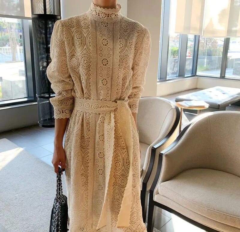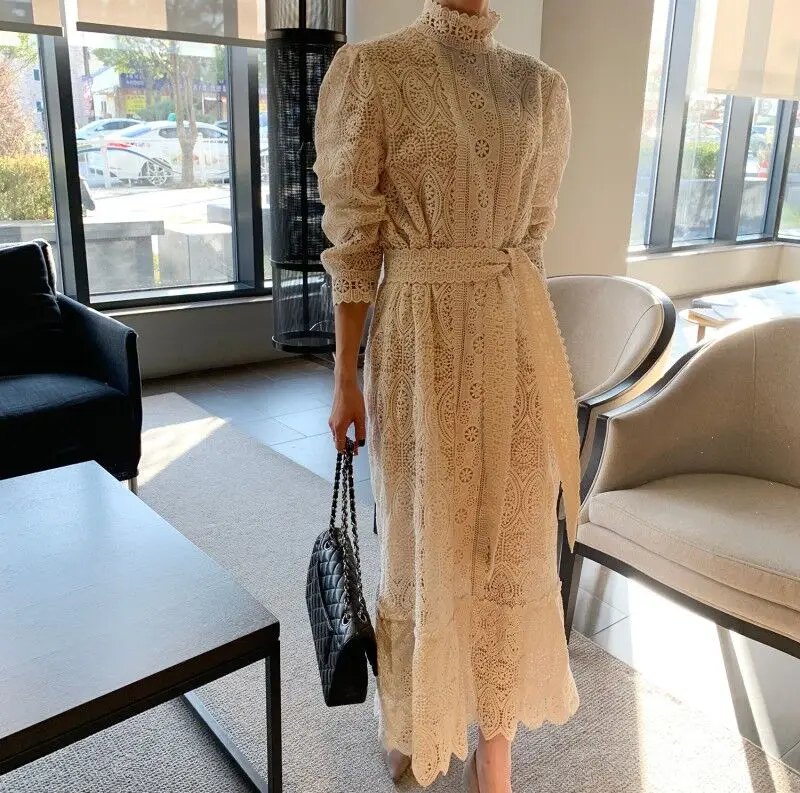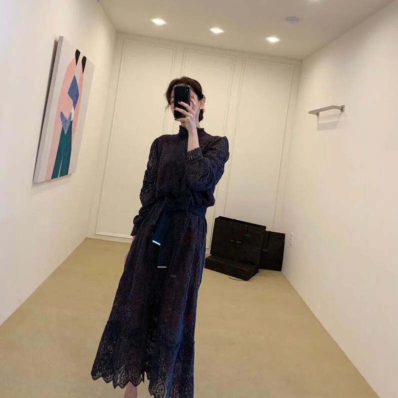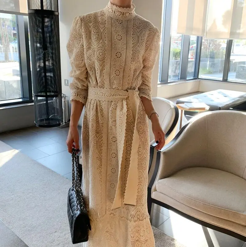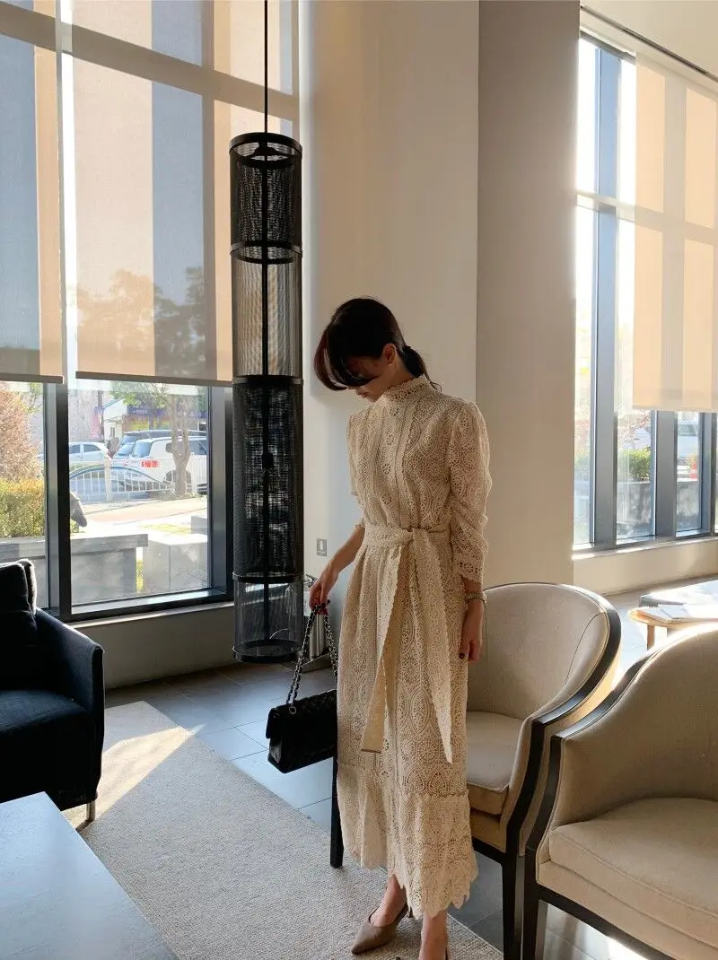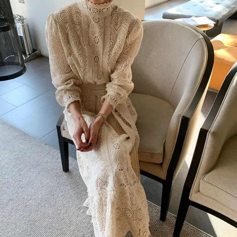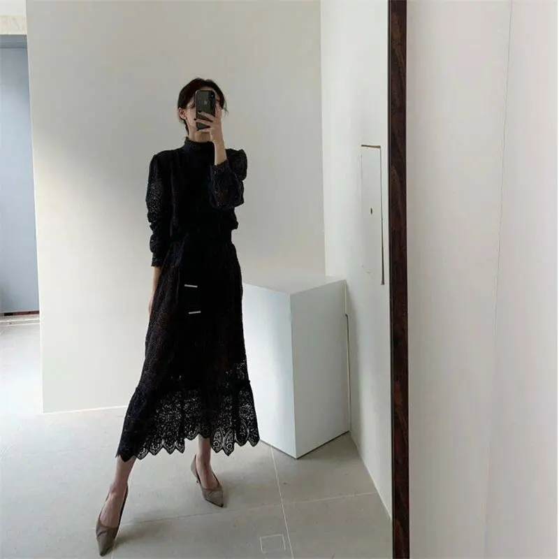 HziriP 2020 Stylish Lace All-Match Korean Elegant Lace-Up Chic Hook Flowers Women Sweet Gentle Fashion Girls Female Long Dresses