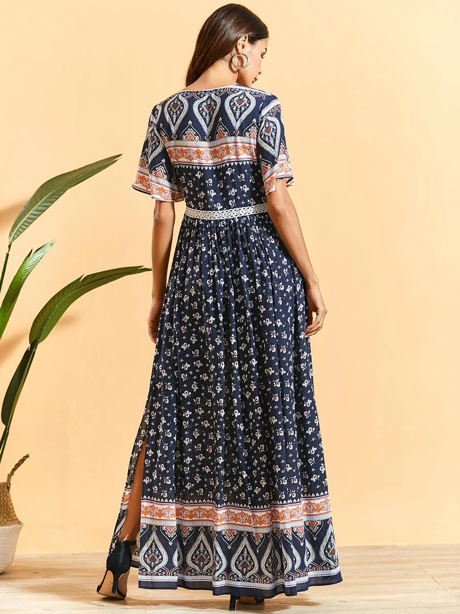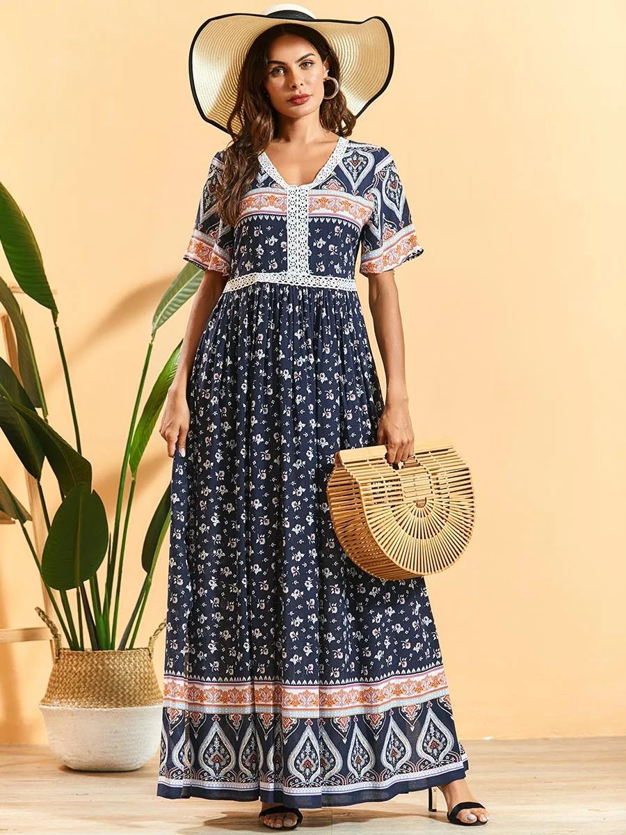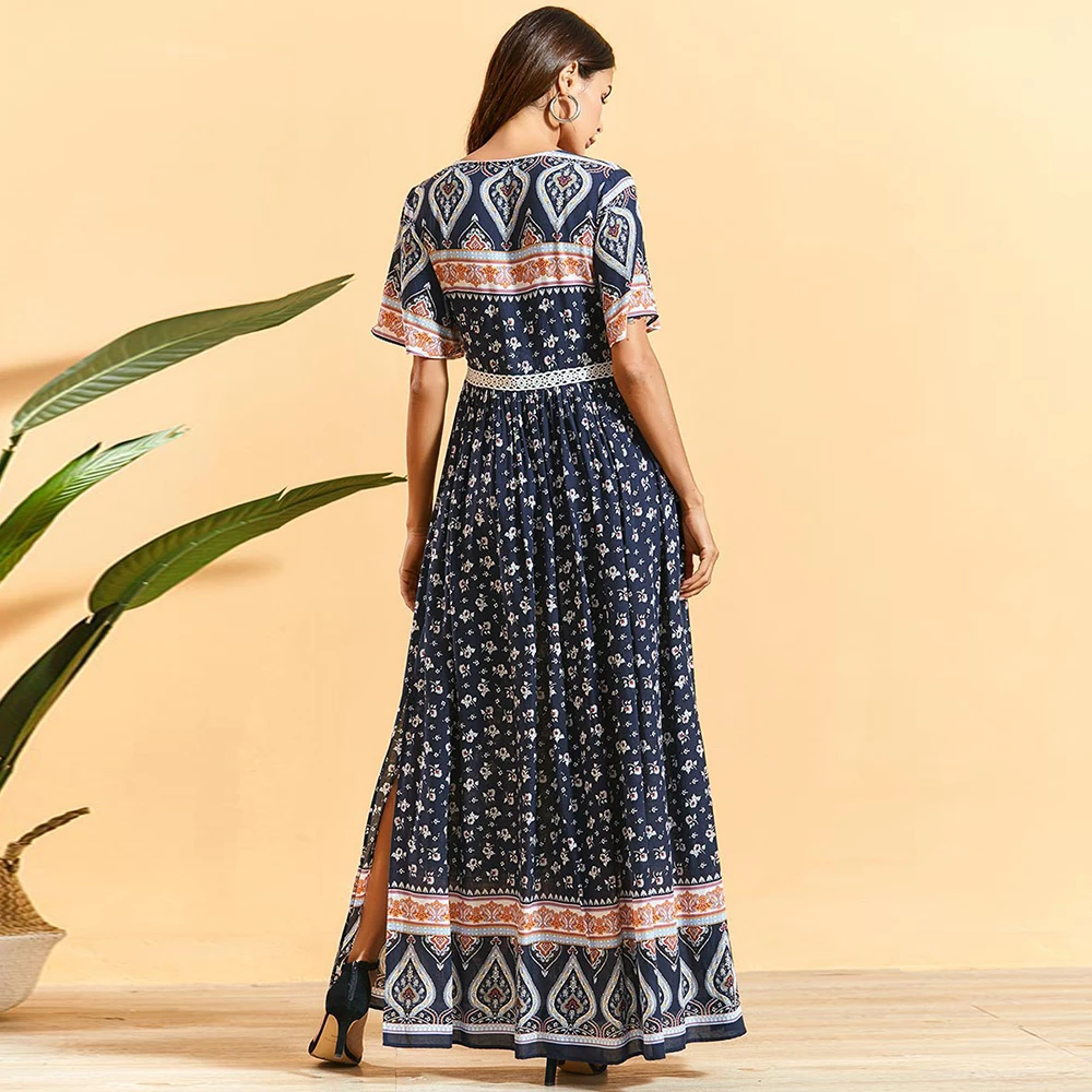 Best Price Comparison With Siskakia Bohemian Summer Long Dress Elegant Ethnic Floral Lace Patchwork Empire Swing Side Slit A Line Dresses 4XL Navy Blue New