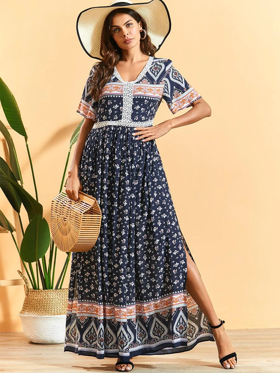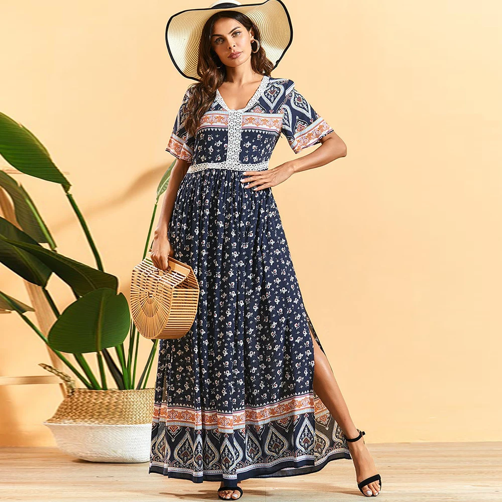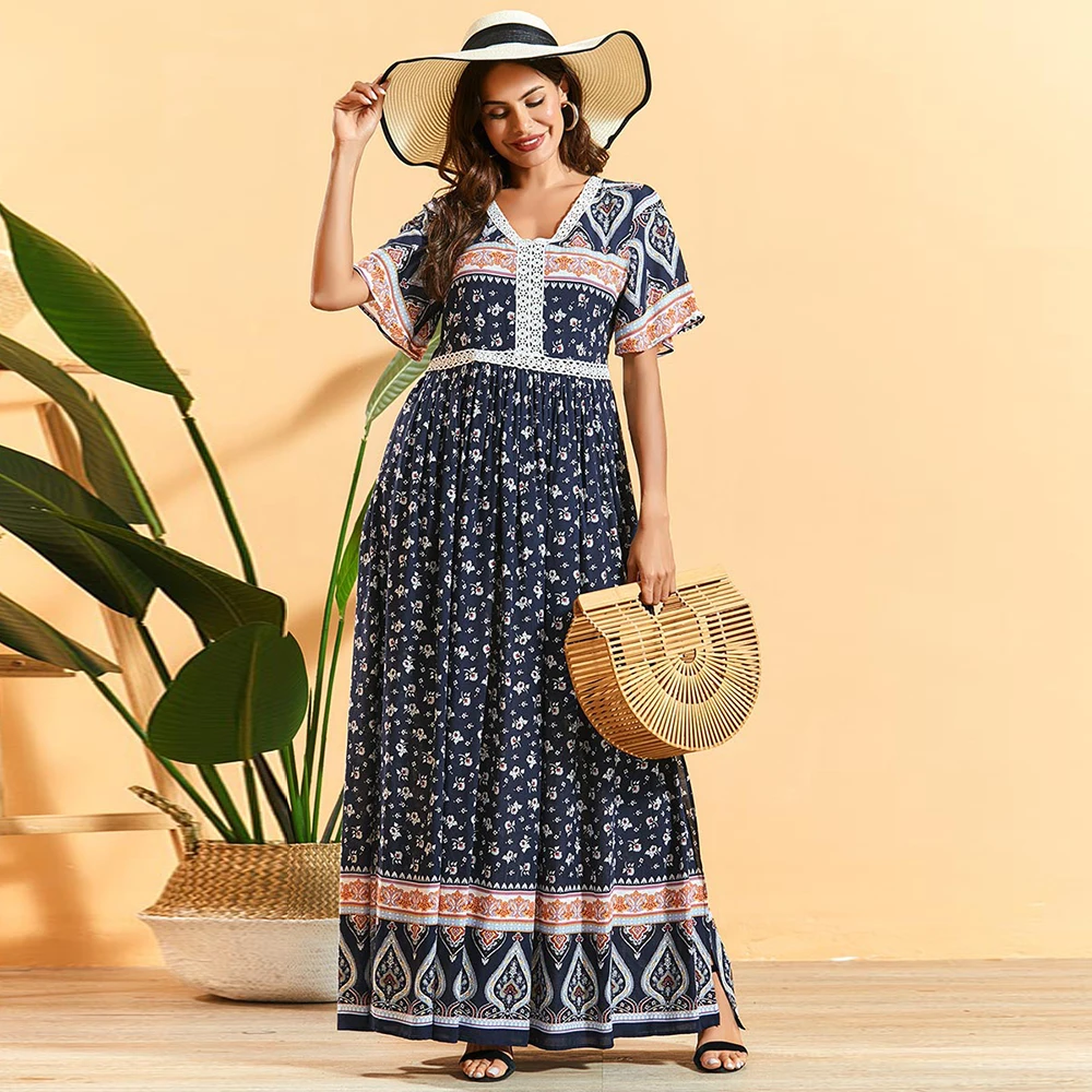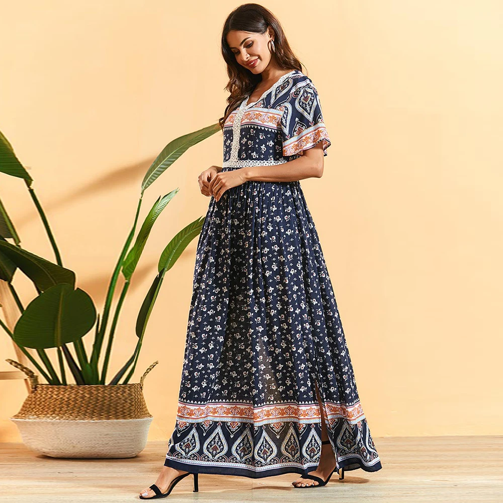 | Siskakia Bohemian Summer Long Dress Elegant Ethnic Floral Lace Patchwork Empire Swing Side Slit A Line Dresses 4XL Navy Blue New |