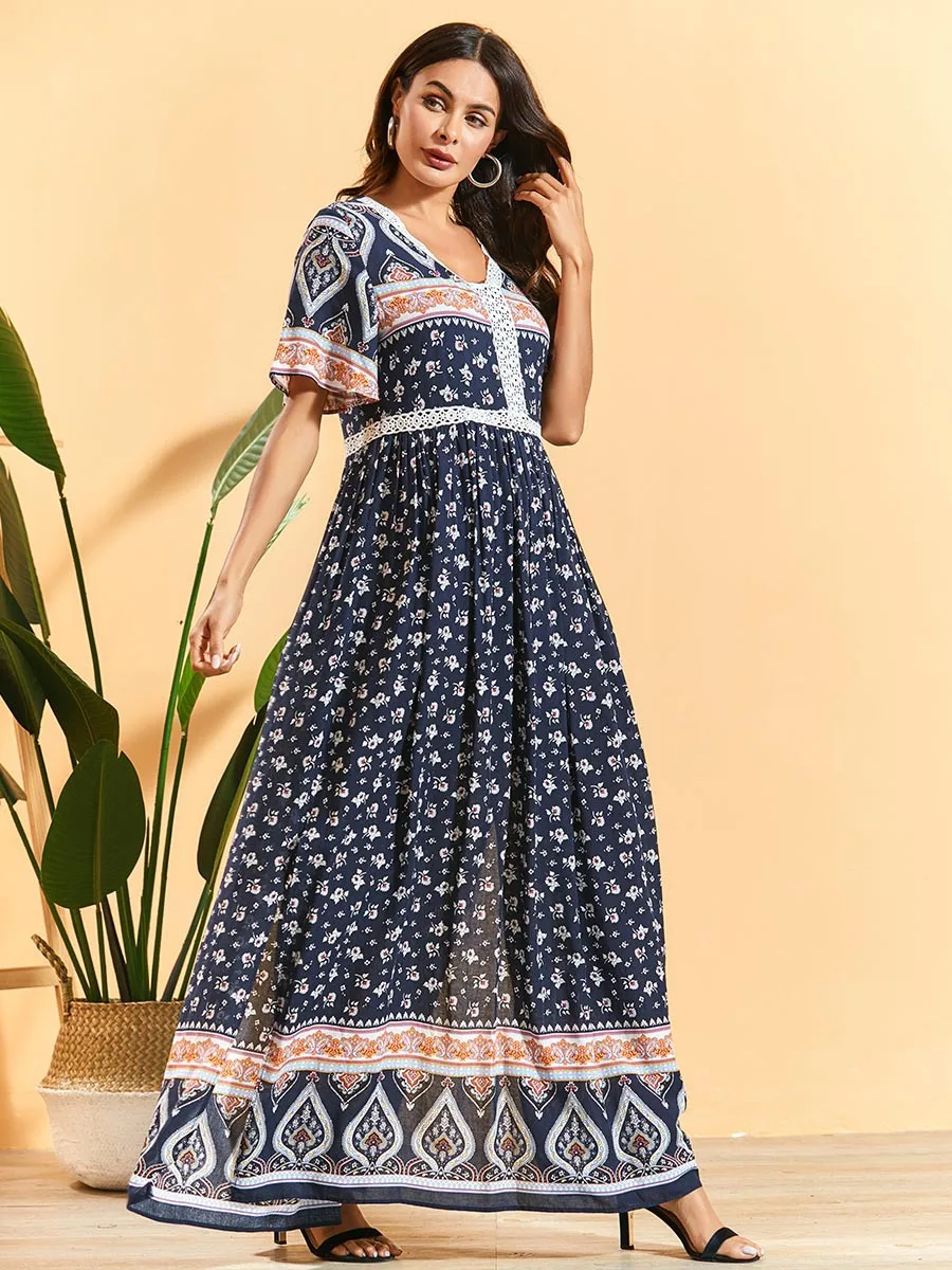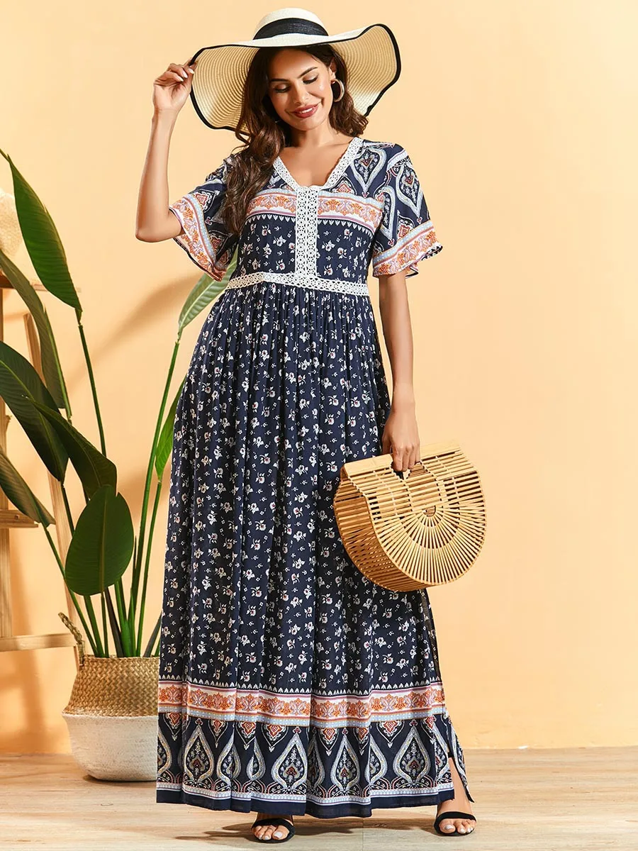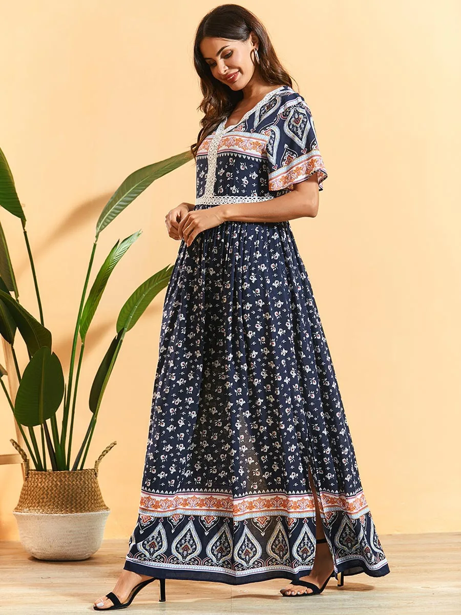 | Siskakia Bohemian Summer Long Dress Elegant Ethnic Floral Lace Patchwork Empire Swing Side Slit A Line Dresses 4XL Navy Blue New |