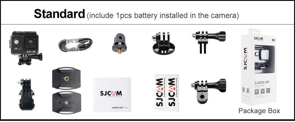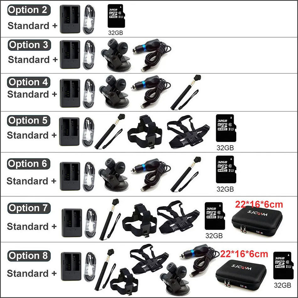 --------------------------------------------------------------------------------------------------------------------------------------------------------------------------------------------------- Standard:As the photo show; Option 2:Standard+Dual Charger+32GB Memory Card Option 3:Standard+Dual Charger+Car Charger+Suction Cup Holder Option 4:Standard+Dual Charger+Car Charger+Suction Cup Holder+Selfie Stick Option 5:Standard+Dual Charger+Selfie Stick+Head Strap+Chest Strap+32GB Memory Card Option 6:Standard+Dual Charger+Car Charger+Suction Cup Holder+Selfie Stick+32GB Memory Card Option 7:Standard+Dual Charger+Selfie Stick+Head Strap+Chest Strap+32GB Memory Card+SJCAM Bag(Large Size)