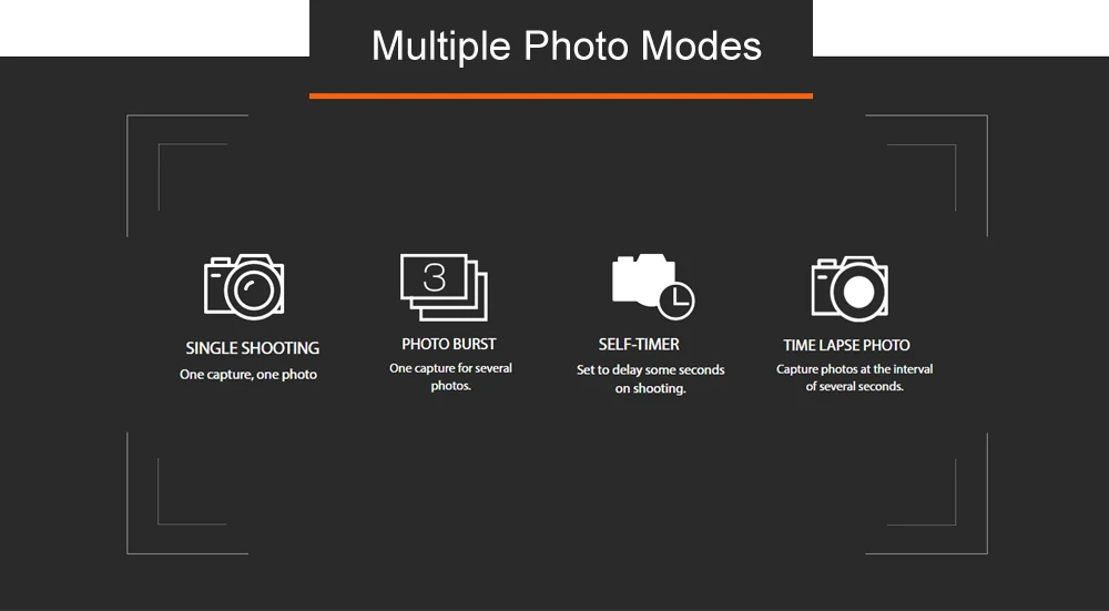 Features 4K High Quality Videos No more worry about shooting in the movement. With the 4K high resolution, you can record stunning footage and great details 20MP Photos, Various Photo Modes Single shooting, Time-lapse photo, Self-timer, Photo burst