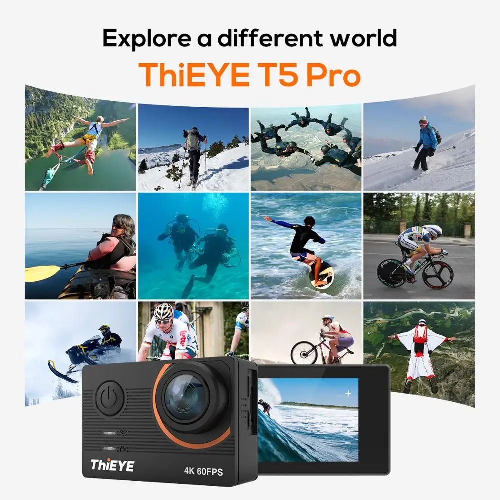 ThiEYE action camera T5 Pro shoots native real 4K at an incredible frame rate of 60fps, is able to capture the highest resolution combined with the highest frame rate ever seen in an action camera, 4K at 60 frames per second. Record fast-moving action in clear and crisp quality.which enables you to show all your adventures in crisp, brilliant details, and makes you capture every pixel of exquisite and lifelike scene. It's totally different from those Interpolated / fake 4K. So whether you’re having fun with your pets, hitting the road on a bike, or riding the wind surf, just take it and upgrade your world! Distortion Correction Superwide FOV usually causes a barrel distortion to have a wider view. Distortion Correction function of ThiEYE T5 Pro decreases or eliminates the distortion to get more natual shooting effect. 6 Axis Gyro Stabilizer Support Electronic Image Stabilization (EIS)at 4K & 1080P With a Built-in Advanced 6 axis (EIS) Gyro Stabilizer, you can capture stunningly clear and stable video handheld, mounted to your favorite gear and more. Whether you are biking, motorcycling or running, Gyro will minimize blurring and reduce shakes without the use of handled rigs or post-production editing, finally delivering more smooth and steady footage. Waterproof up to 197''(60 Meters) Your Best Companion for Underwater Activities Sealed in a professional IP68 waterproof housing, ThiEYE T5 Pro is able to withstand heavy water pressure deep to 197 feet (60 meters). The housing can also protect the camera from dust &shock. What a perfect partner for diving and other underwater activities! Remote control Enjoy the Freedom of Remote Control Simply pressing the button on remote can drive your ThiEYE action camera T5 Pro, you can also strap it to your wrist or attach it to your gear. It is your reliable companion for dynamic recording and live streaming, ranging from daily life affairs to outdoor activities. 360° Free Adjusting, Free Shooting ThiEYE T5 Pro quick release buckle enables 360°rotation and locking into any spot you put it, making it possible for quick adjustment of shooting angles, giving you the freedom to capture a variety of precious moments when doing outdoor activities. Designed with 1/4” Threaded Insert Multiple Mounts, Multiple Playing ThiEYE T5 Pro is designed with a 1/4” Screw Hole on the bottom, which applies to universal mount adapters, like tripods, bike mounts, selfie sticks etc for you to create remarkable recordings. With ThiEYE unique mounts and accessories, you can mount it on table, wall, bicycle, or anywhere else, wear it or put it on your pets to shoot a first perspective video Adventure in Slow Motion Never Miss a Beat One of the amazing thing is that T5 Pro can capture all high-speed movements at 720P 120fps in precise details. It’s perfect for freezing frame when playing back your splendid actions in skiing and parkour, or those stunning scenes like diving and base jumping. Also, you can make a slow motion footage where you can catch some moments unfolded to you before. Time-Lapse Videos at Your Fingertips Every Second is a Highlight Capture subtle movement in precise details. You can set time-lapse mode to capture individual video frames at the interval of 1/3/5/10/30/60s and create a video much faster than the real-time one. It is especially useful for continuous recording over a prolonged period, such as a flower blooming, a sunrise at dawn or a changing clouds and so on. All in The-EYE The 170˚ wide angle lens ensures you a whole experience with high color saturation and stunning clarity. It is also flexible for adjusting different viewing angles: narrow, medium and wide, all in only one shot. ThiEYE App Remote Control, Editing and Sharing Simply download ThiEYE Cam app from Google Play or app store and then connect it with this camera model T5 Pro. Now you can remotely control your camera, such as shooting videos and photos. Adjusting the settings, you could also view and edit the videos by adding effects, music and transitions easily. Thus creating more attractive videos in a unique way. Then share them instantly to social media platforms, all your friends, even all global ThiEYE fans. Just develop your creativity, create your own movie, and broadcast it wordly. How to Create Live Stream Via ThiEYE LIVE APP