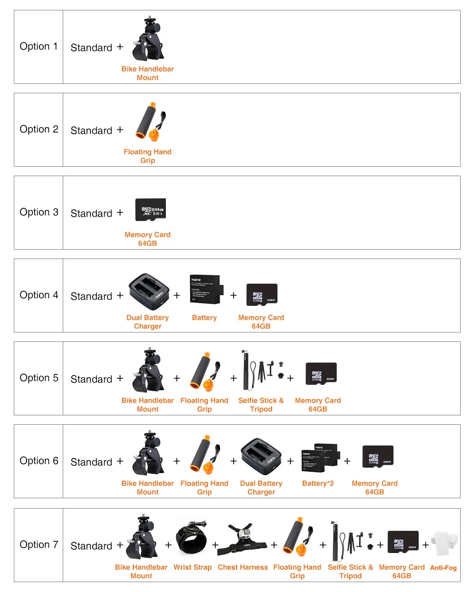Option 7: Standard + Bike Handlebar Mount + Wrist Strap + Chest Harness + Floating Hand Grip + 35" Selfie Stick & Tripod + 64GB Memory Card + Anti-Fog