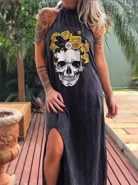 | 2020 Summer Dresses Women Punk Style Loose Halter Neck Sleeveless Skull Print Female Dress Street Side High Split Flower Print |