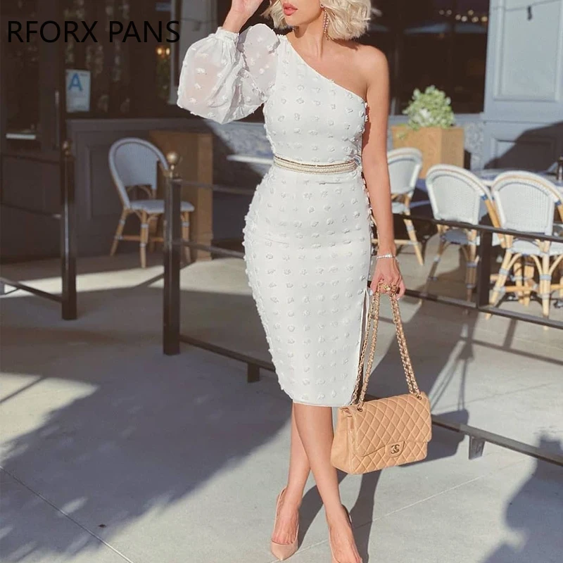 | One Shoulder Puffed Sleeve Swiss Dot Dress Bodycon Dress Sexy Dress Women Dress |