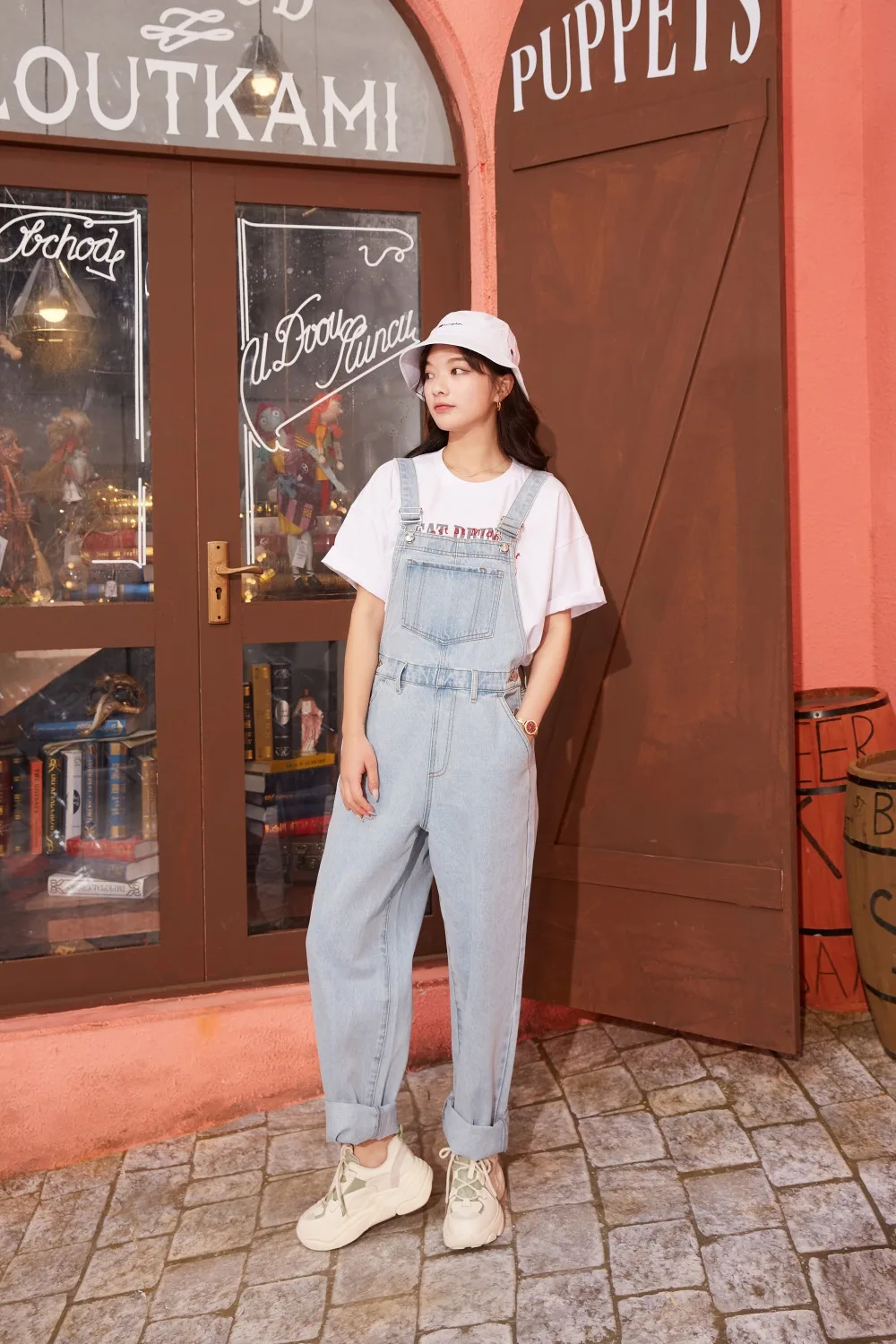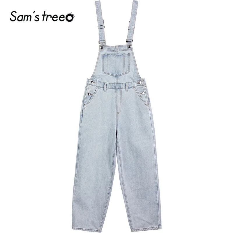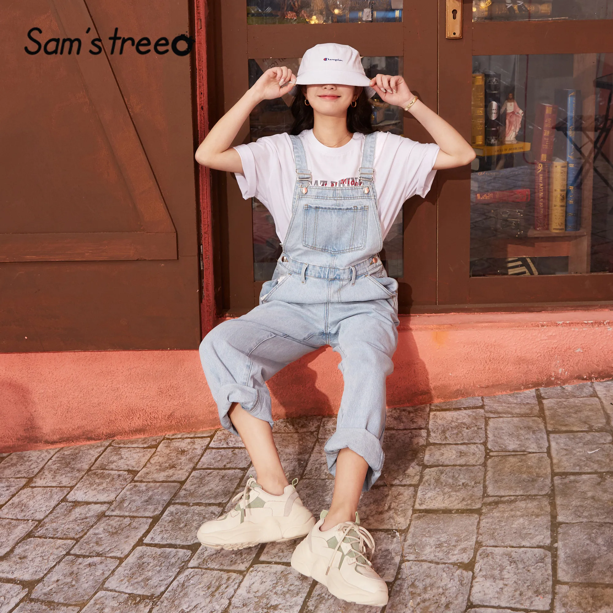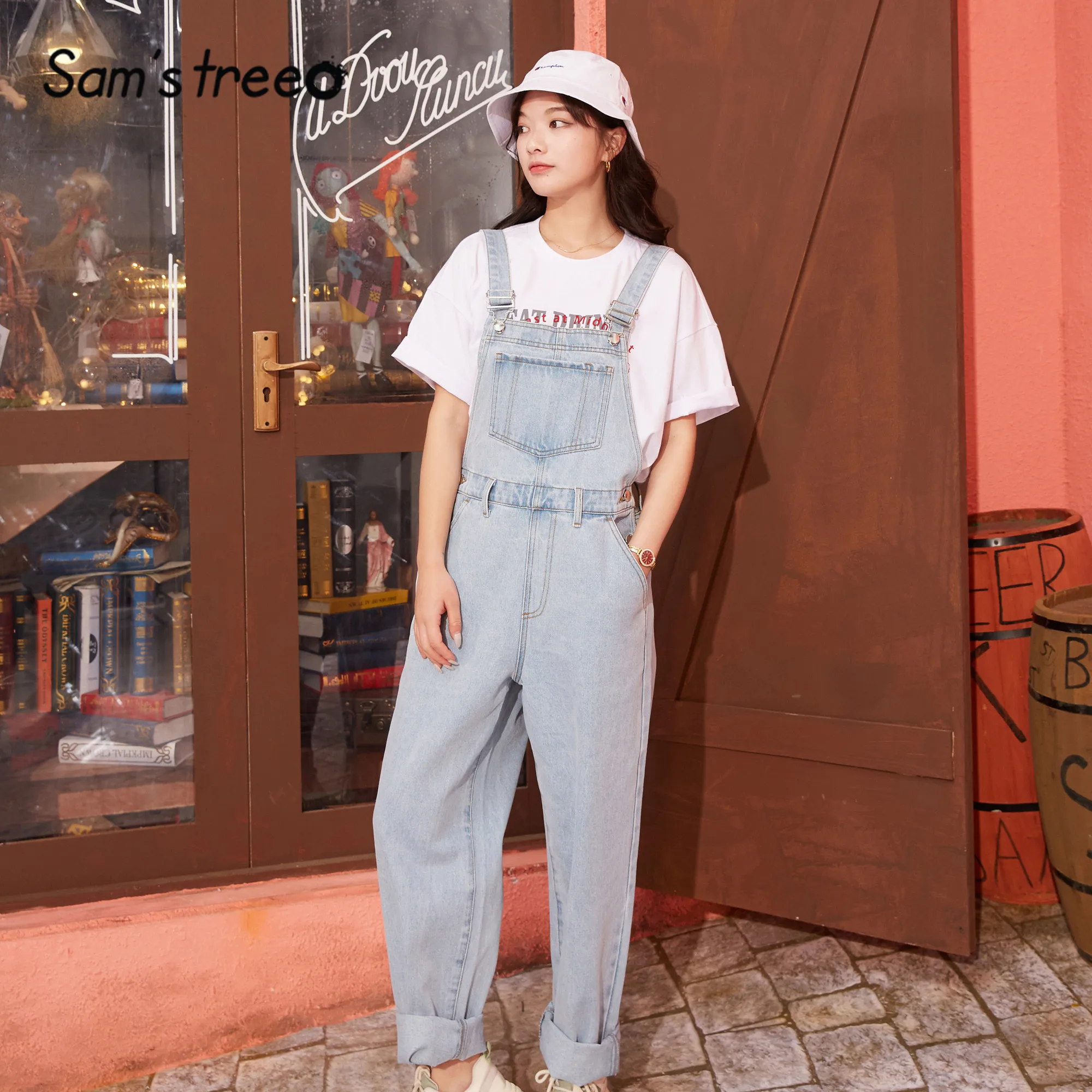 | SAM'S TREE Blue Solid High Waist Straight Washed Denim Overall Jeans Women 2020 Spring Pure Korean Girly Casual Basic Jumpsuits |