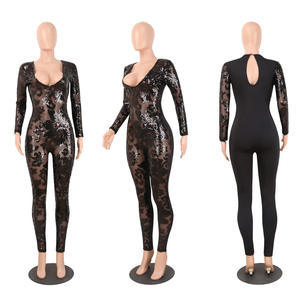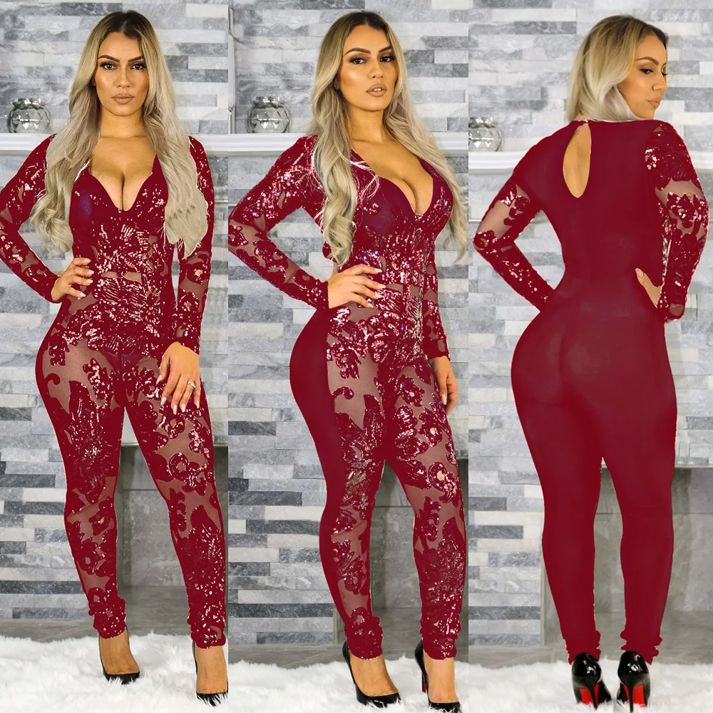 | Sexy Deep V-neck Sequin Jumpsuit See Through Slinky Bodycon Playsuit Jumpsuits For Women 2019 Solid 4 Color Plus Size 3xl |