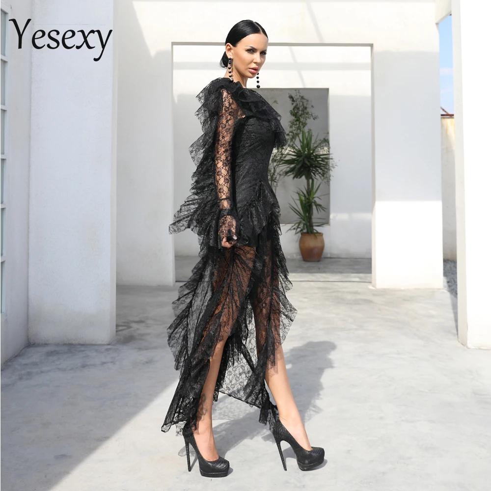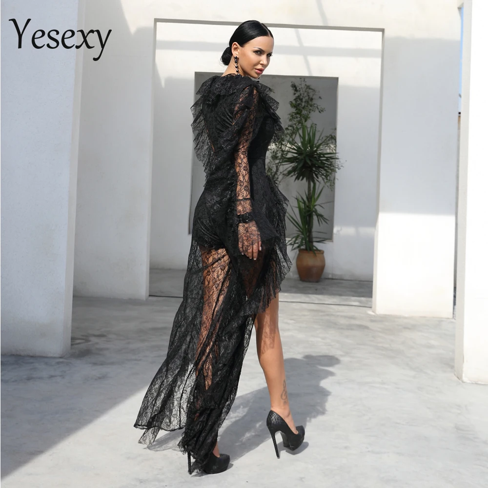 Yesexy 2020 Sexy Deep V Neck Ruffles Long Sleeve Female Overalls Elegant High Split See Through Rompers Women Jumpsuit VR9561