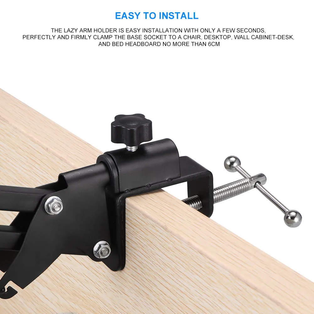 The lazy arm holder is easy installation with only a few seconds, perfectly and firmly clamp the base socket to a chair, desktop, wall cabinet-desk, and bed headboard no more than 6cm.