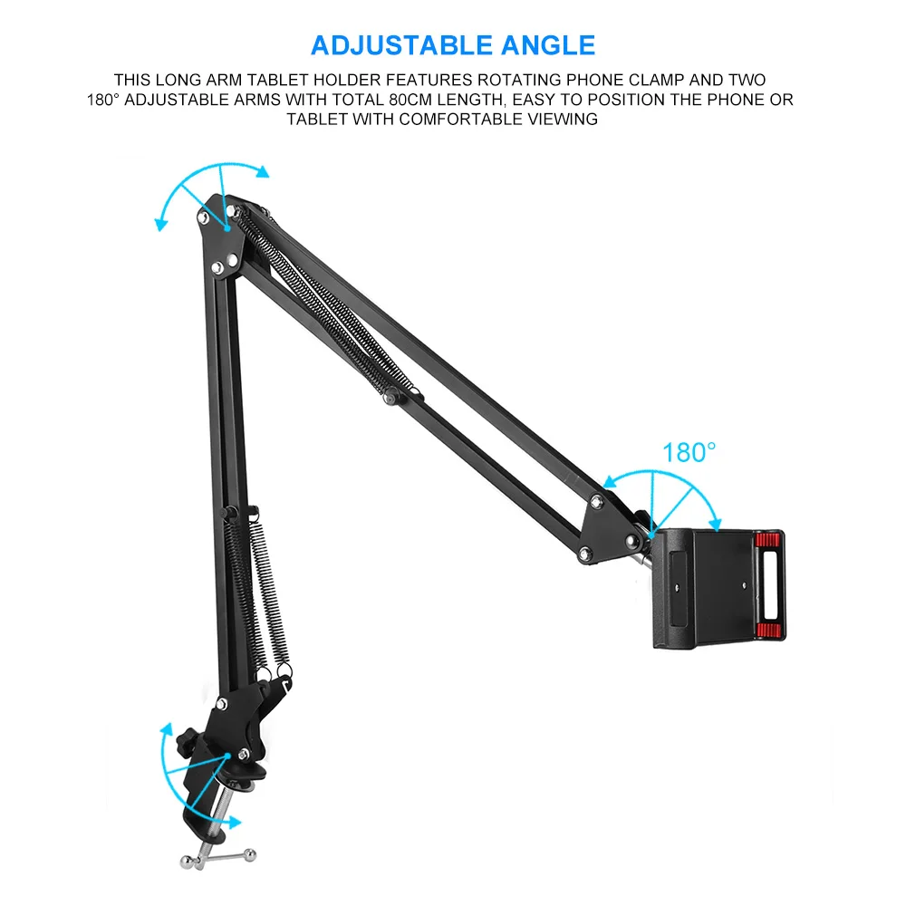 This long arm tablet holder features rotating phone clamp and two 180° adjustable arms with total 80cm length, easy to position the phone or tablet with comfortable viewing.