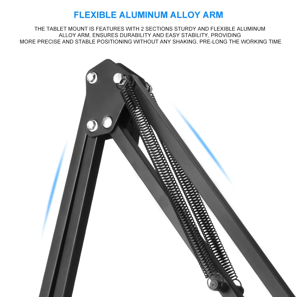 The tablet mount is features with 2 sections sturdy and flexible aluminum alloy arm, ensures durability and easy stability, providing more precise and stable positioning without any shaking, pre-long the working time.