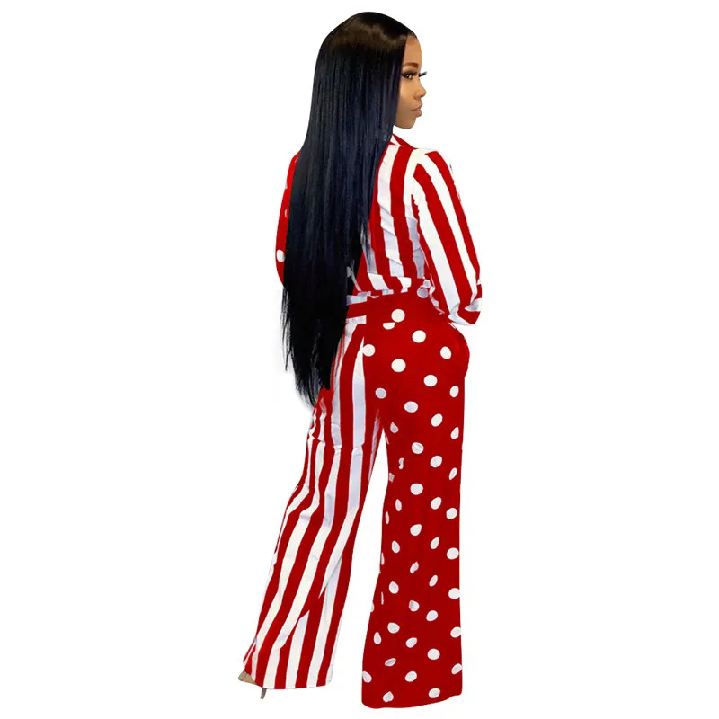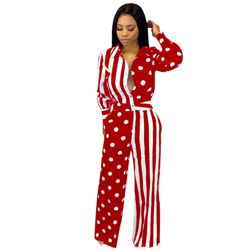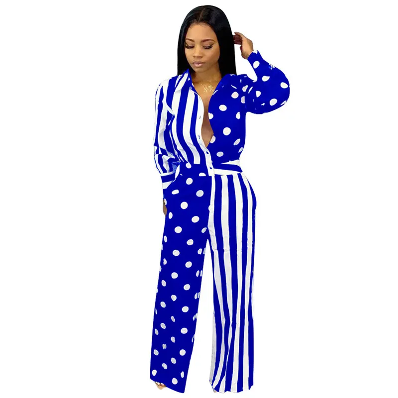 | Adogirl Polka Dots Print Stripe Patchwork Loose Jumpsuit Long Sleeve Shirt Top Wide Leg Pants Casual Romper Office Lady Overalls |
