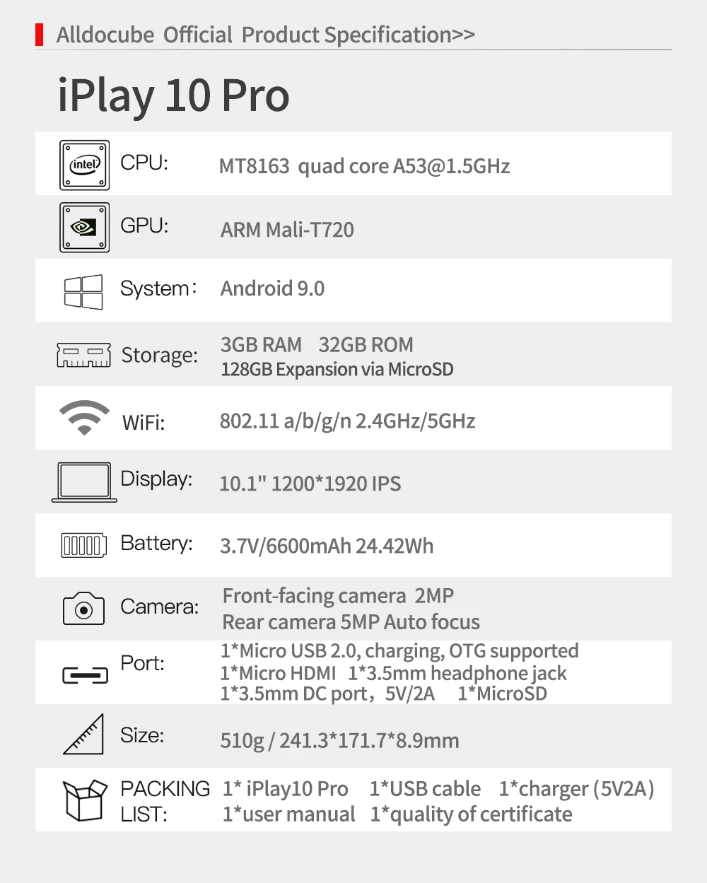 | Alldocube Tablet iPlay10 Pro 10.1 Inch IPS Screen MT8163 Quad Core 3GB RAM 32GB ROM Android 9.0 Dual Camera GPS Wifi BT4.0 |