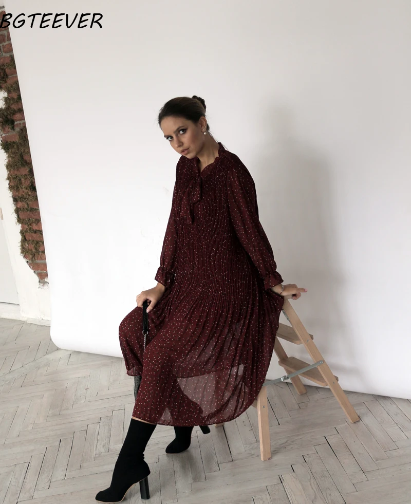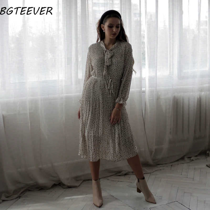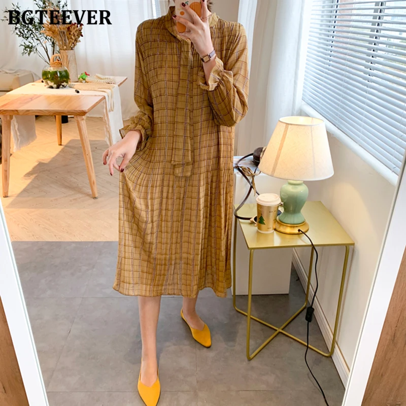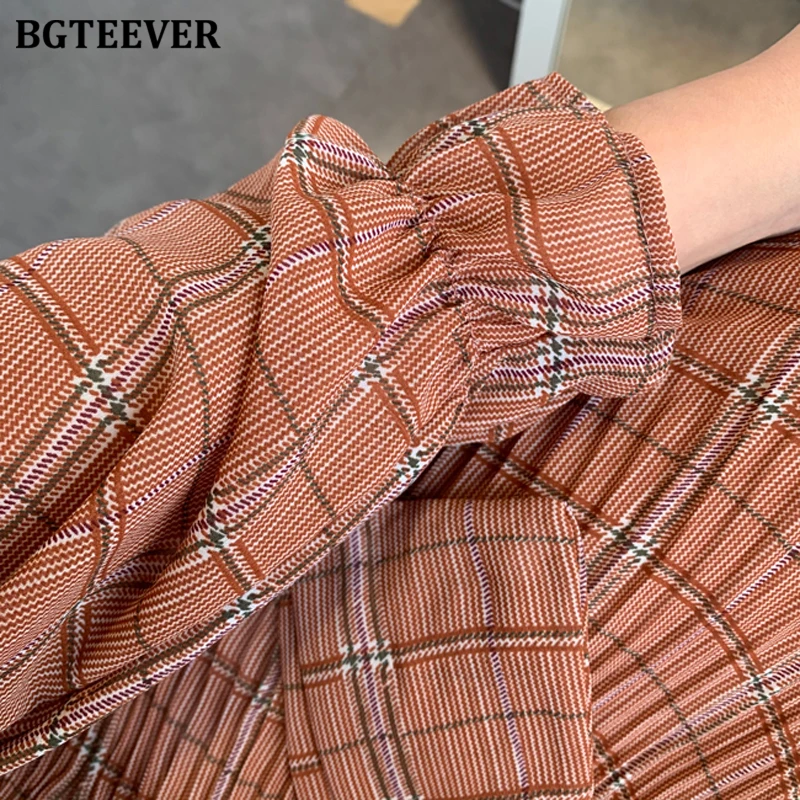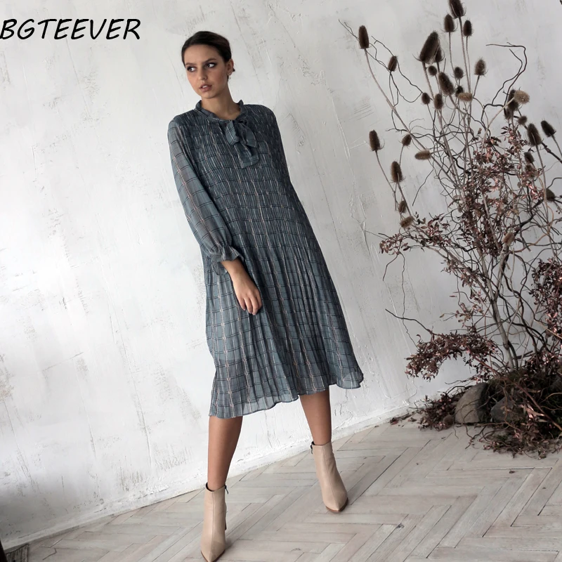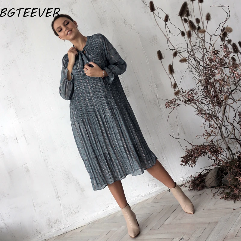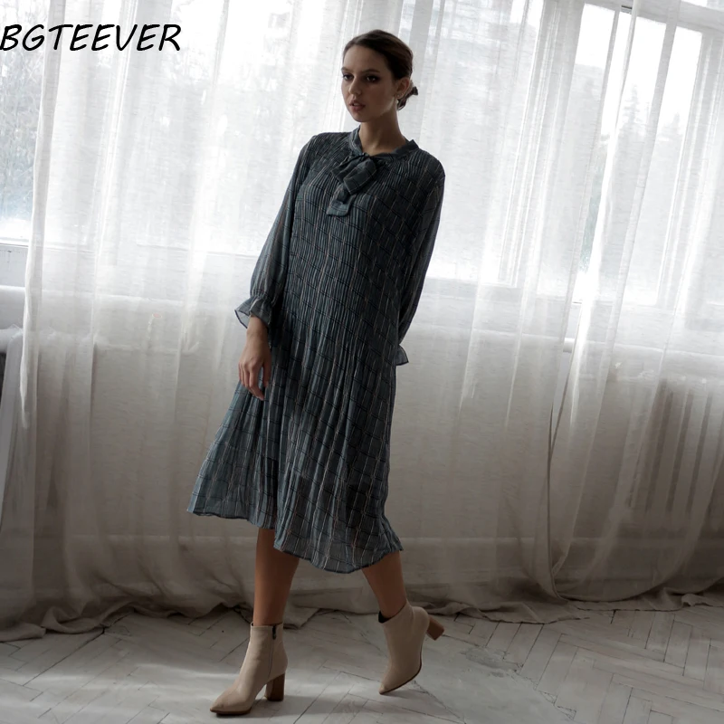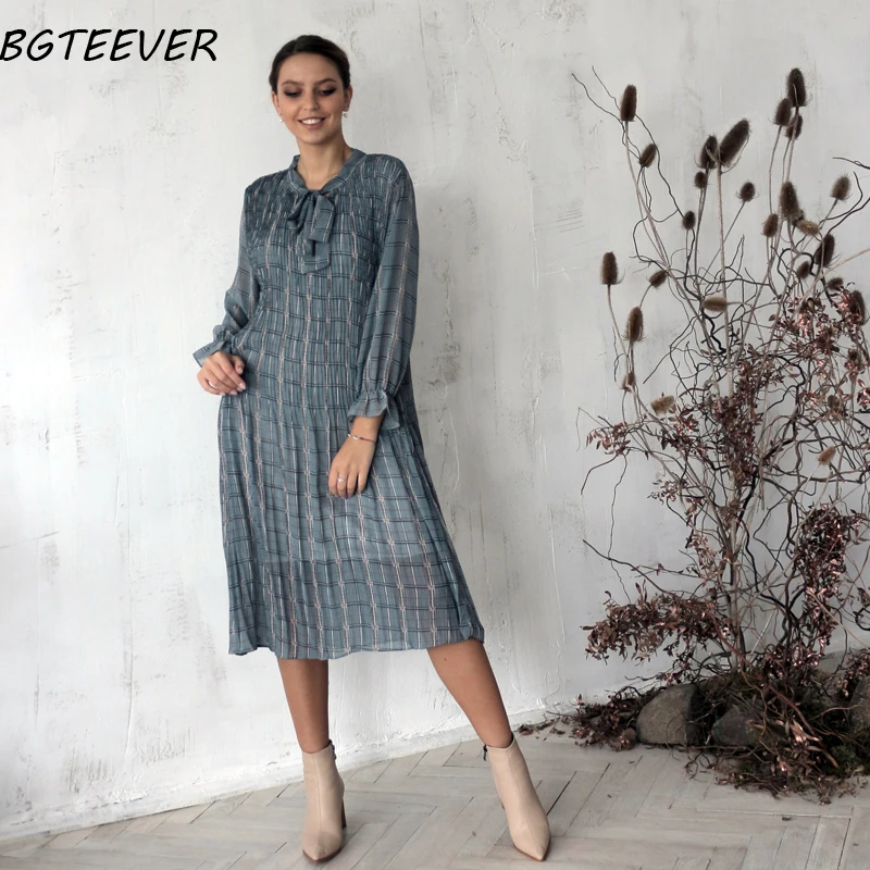 | BGTEEVER Chic Bow Neck Plaid Dress Women 2020 Spring Flare Sleeve Lace-up Pleated Mid-calf Dress Female Chiffon Vestidos femme |