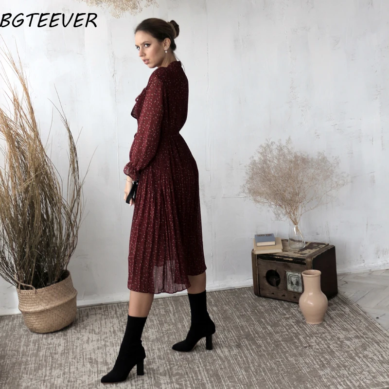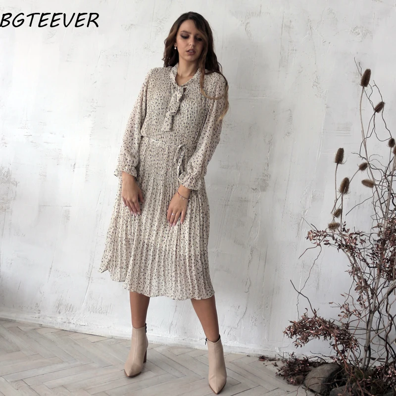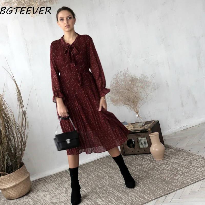 Best Price Comparison With BGTEEVER Chic Bow Neck Plaid Dress Women 2020 Spring Flare Sleeve Lace-up Pleated Mid-calf Dress Female Chiffon Vestidos femme