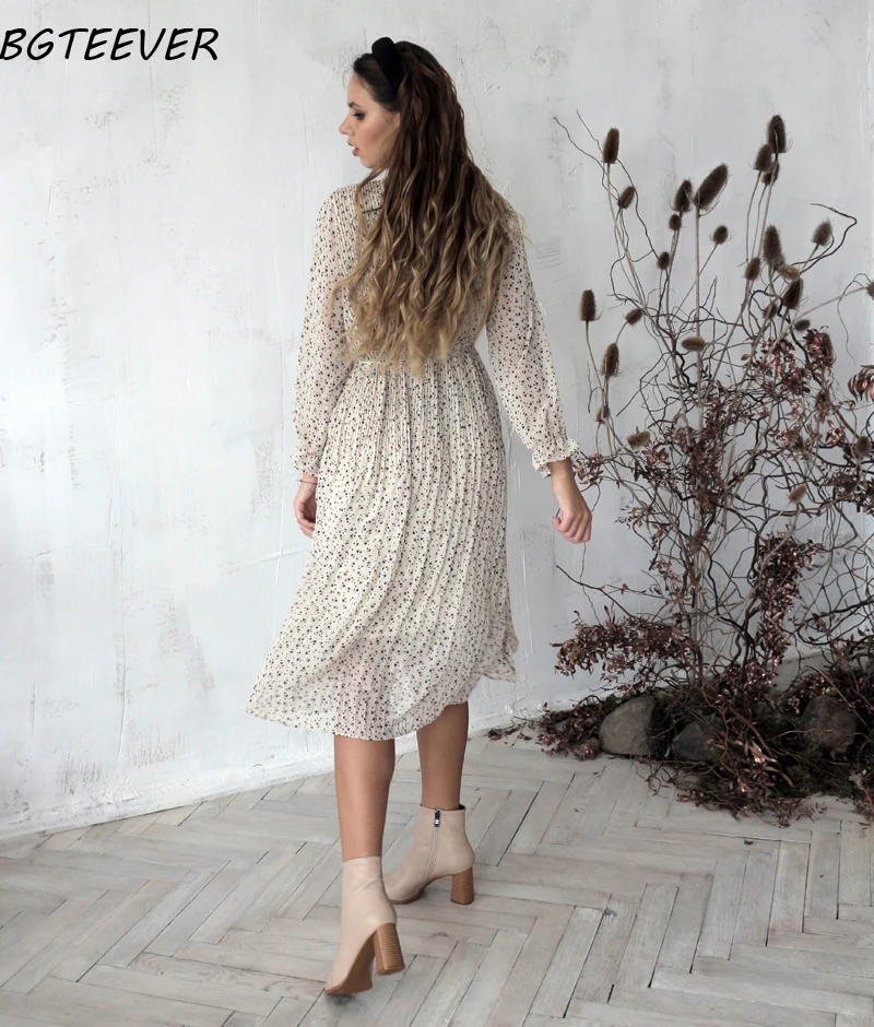 Women Casual Autumn Dress Lady Korean Style Vintage Floral Printed Chiffon Shirt Dress Long Sleeve Bow Midi Summer Dress Vestido