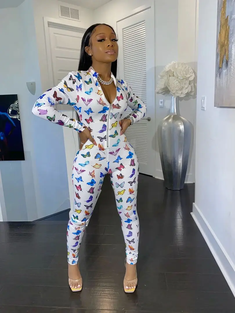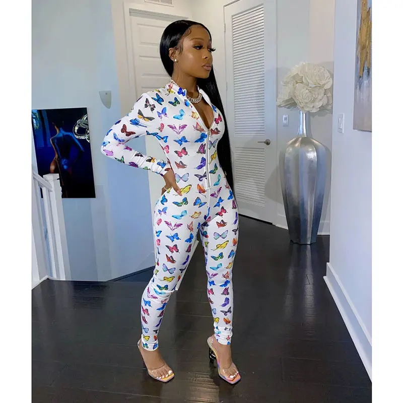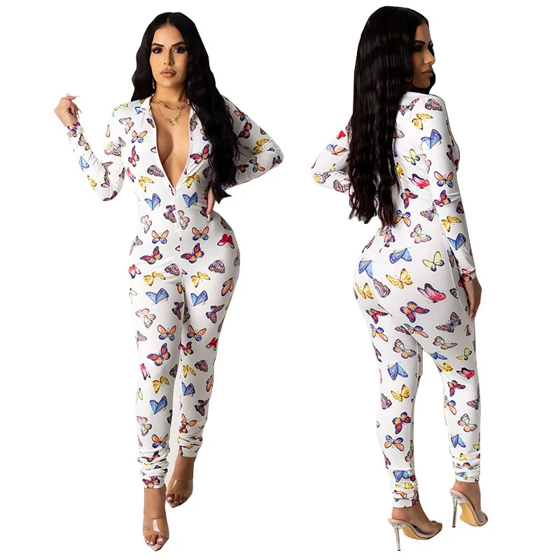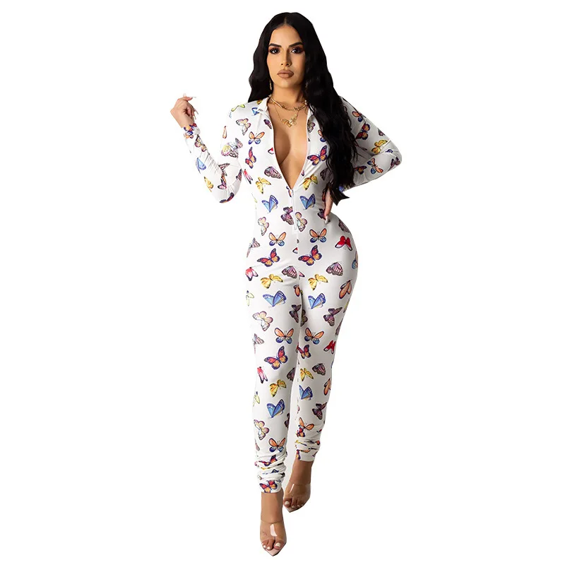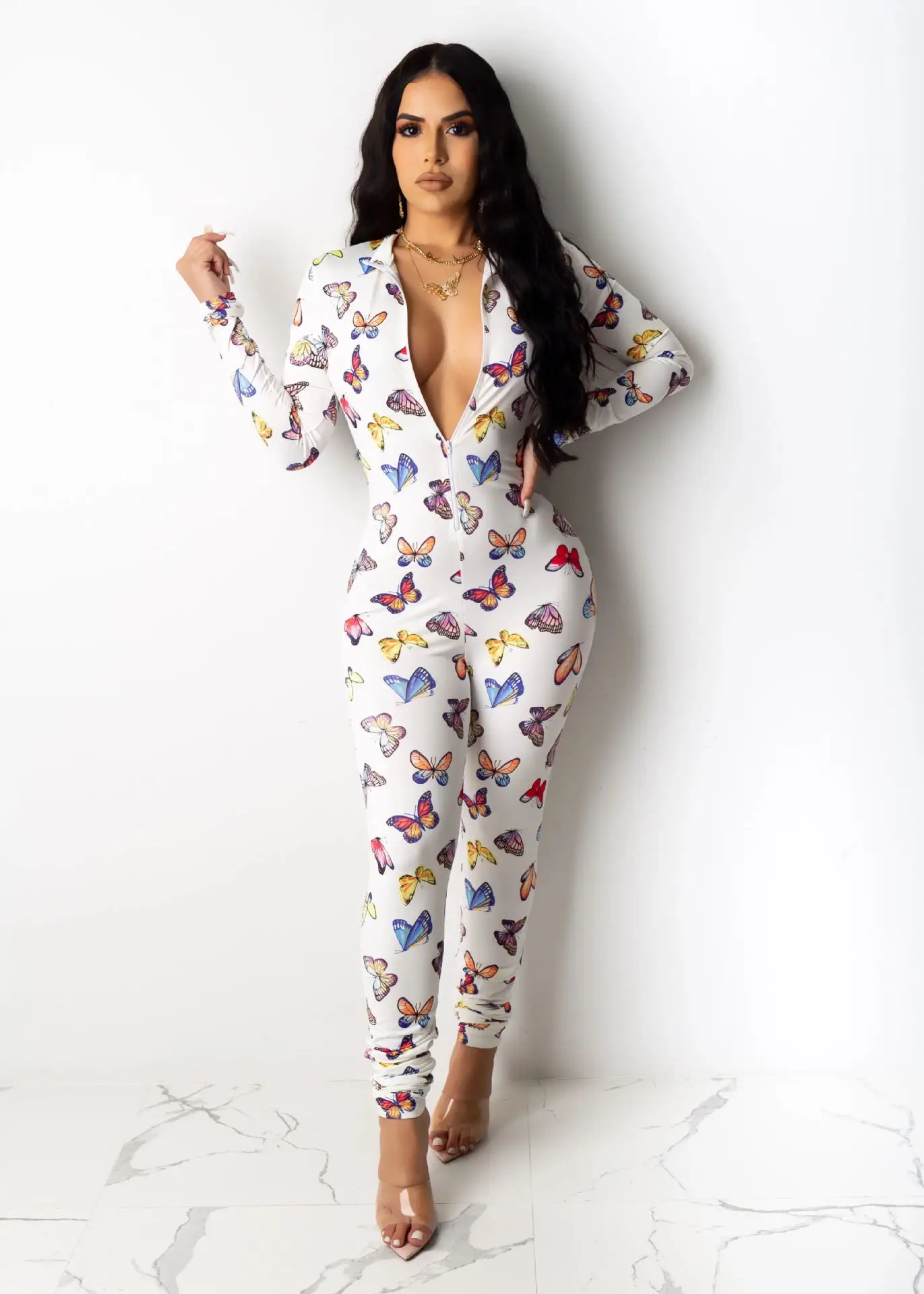 | Butterfly Print White Jumpsuit Women Long Sleeve Zip Closure Playsuit Sexy Skinny Woman Bodycon V Neck Outfits Overalls Romper |