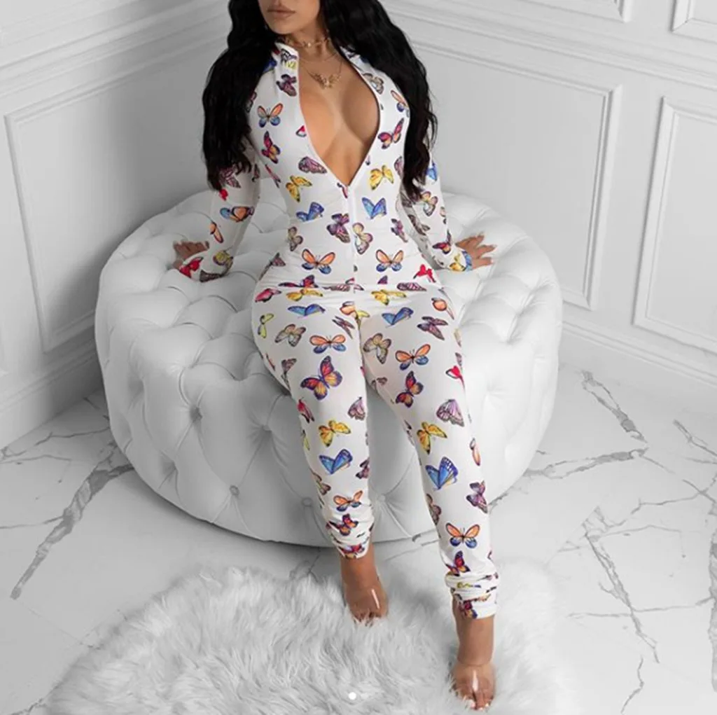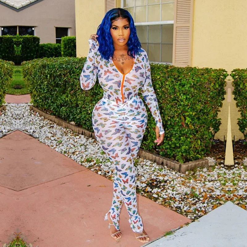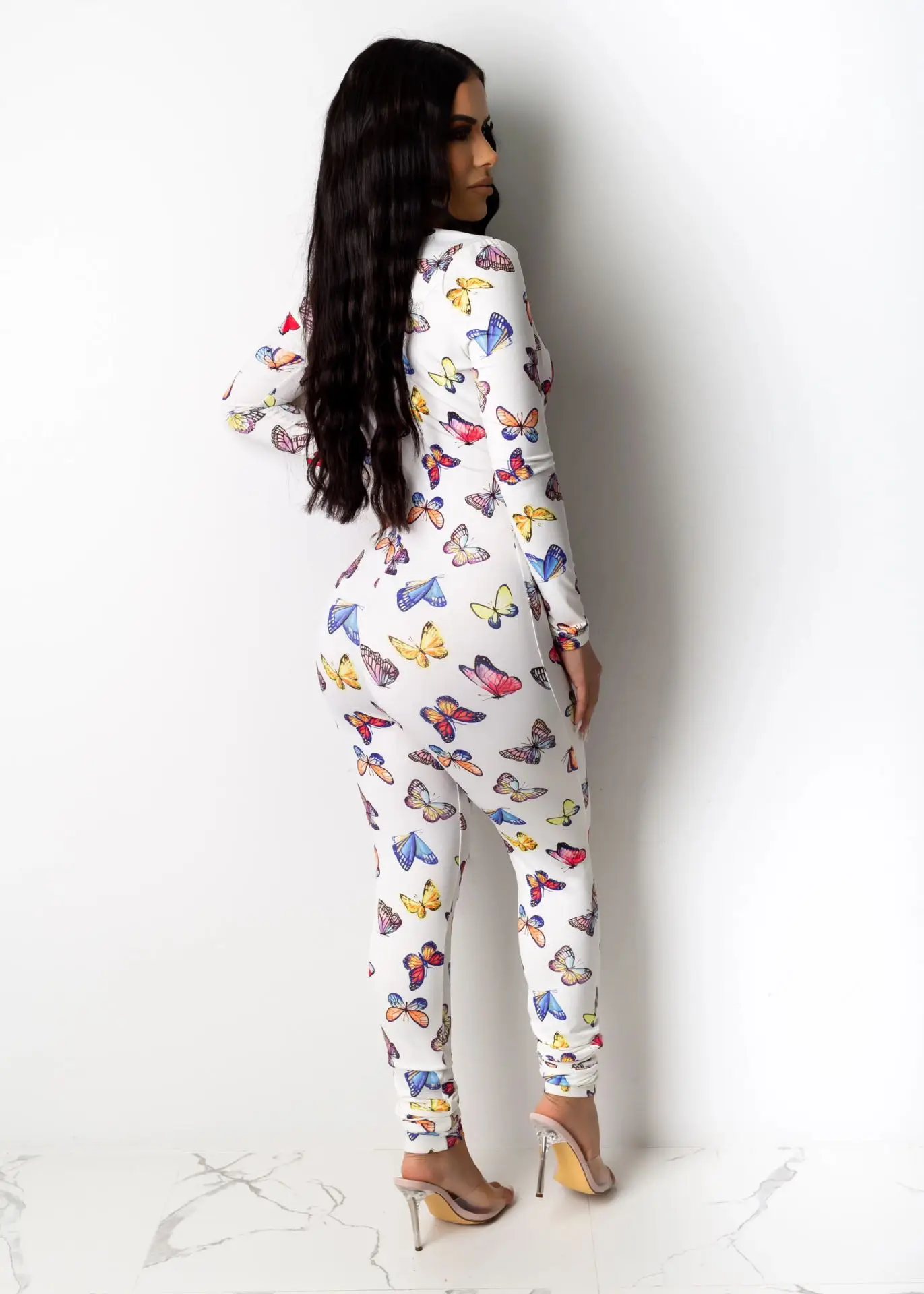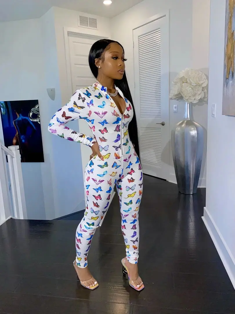 | Butterfly Print White Jumpsuit Women Long Sleeve Zip Closure Playsuit Sexy Skinny Woman Bodycon V Neck Outfits Overalls Romper |