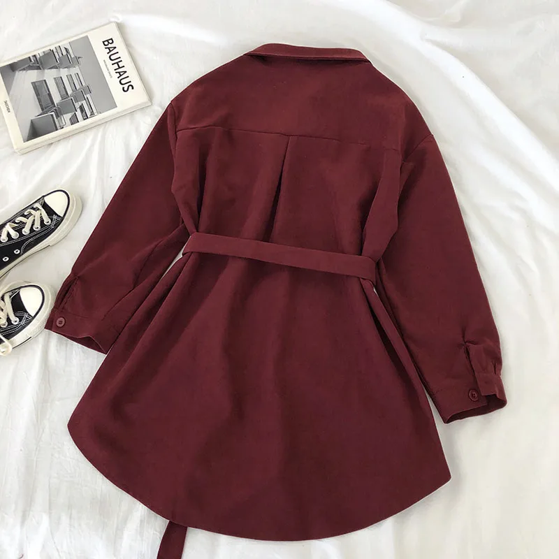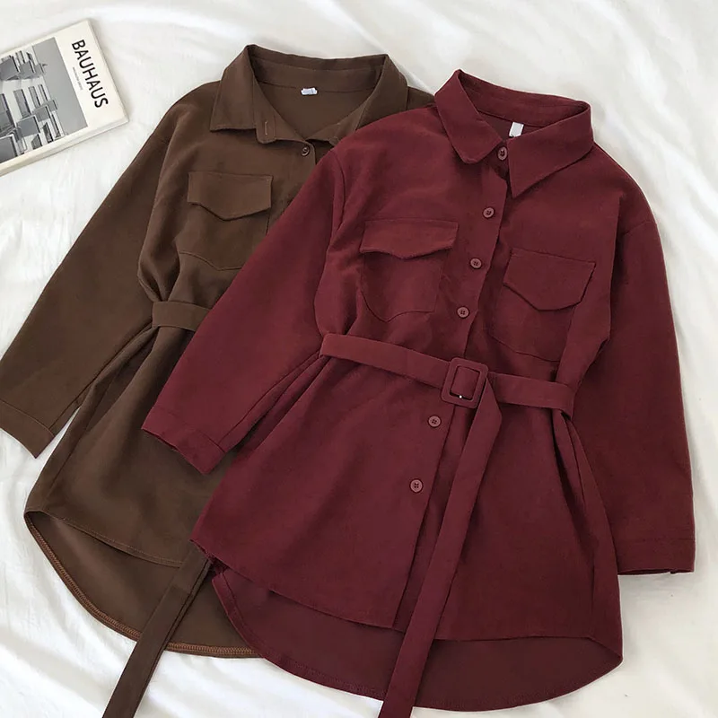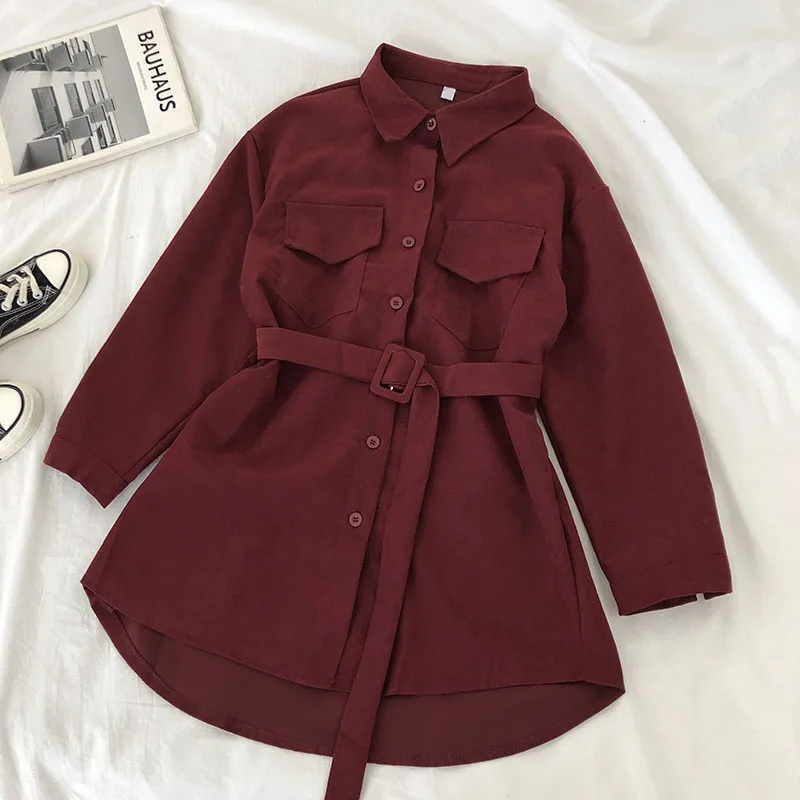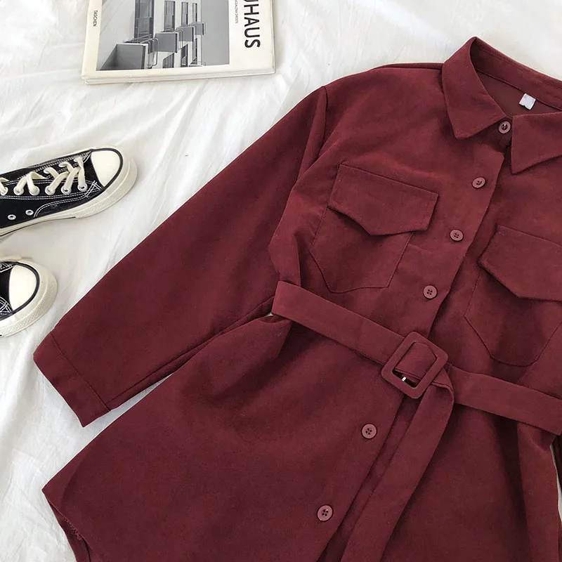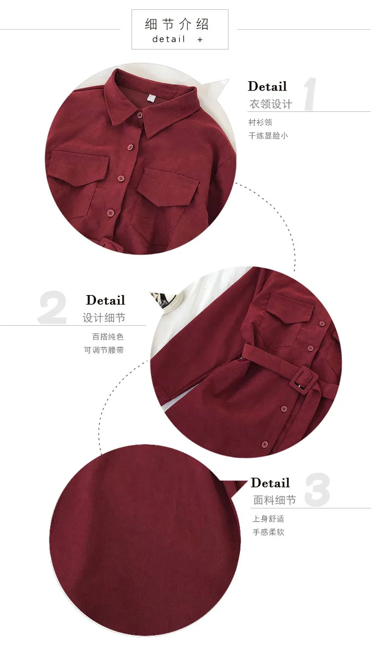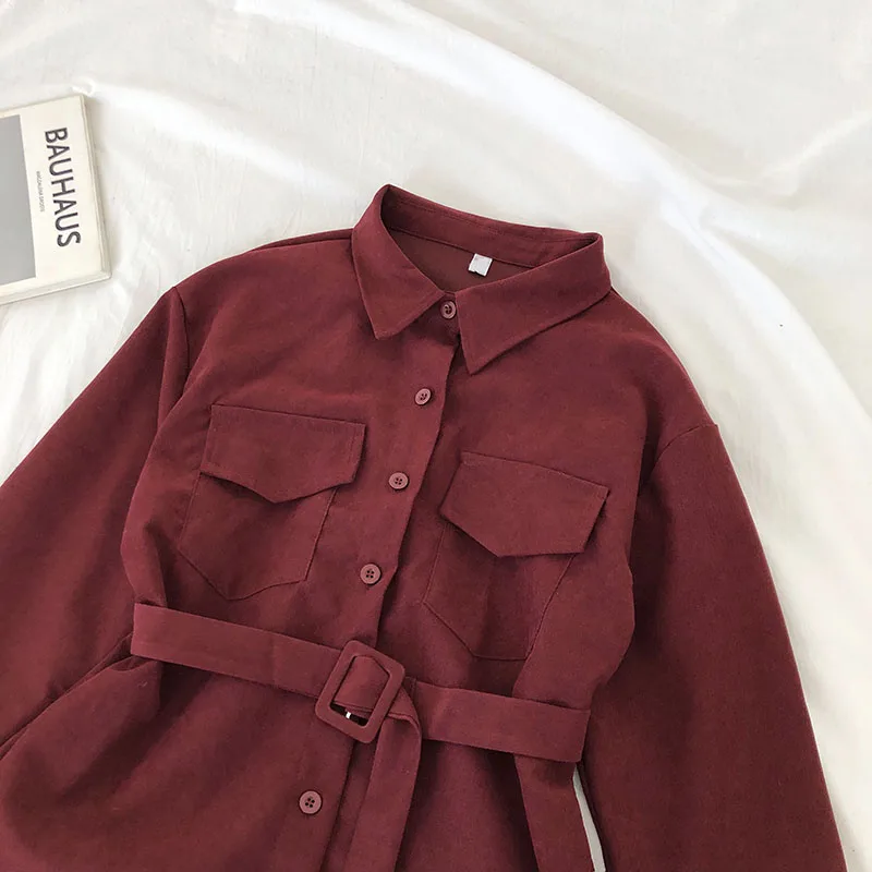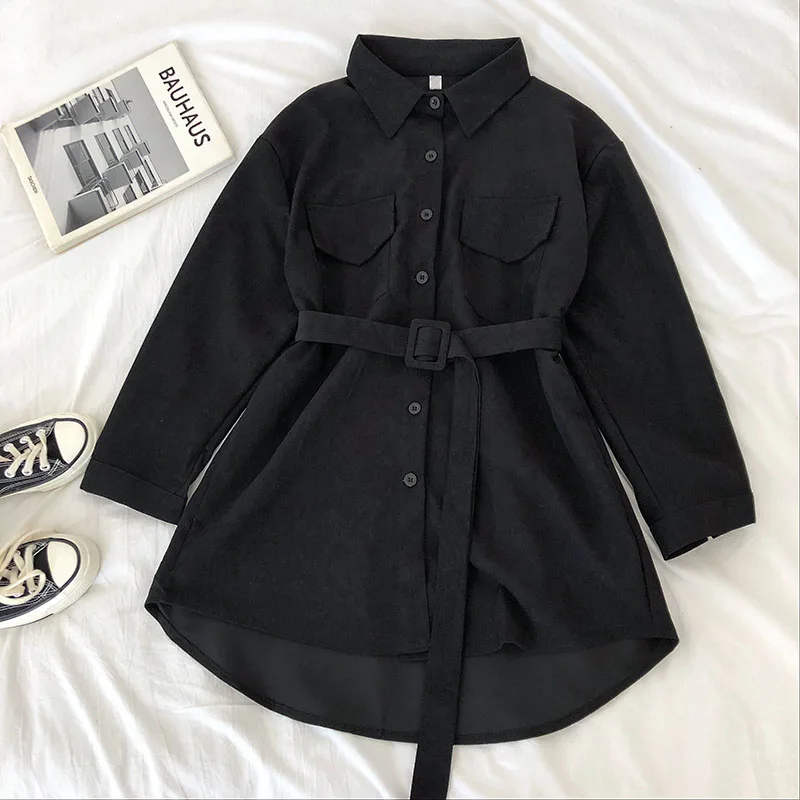 | Corduroy Long Sleeve Dress Women Solid Buttons Pockets Turn-down Collar Simple Elegant Sashes All-match Womens Vintage Harajuku |