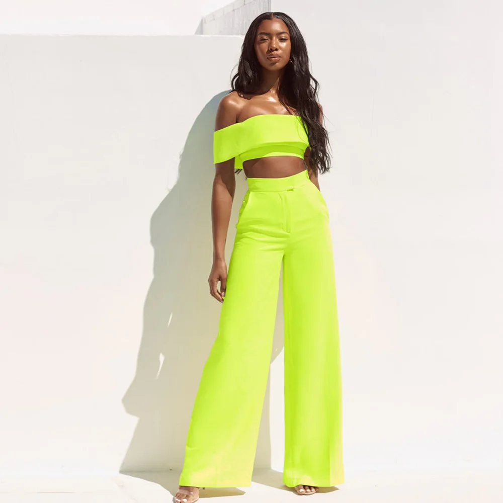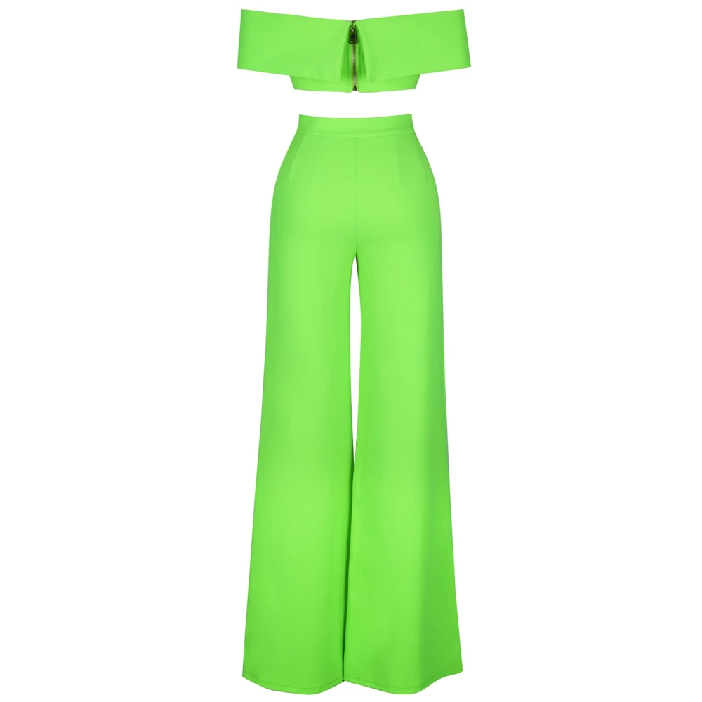 | Deer Lady 2 Piece Pants Set Women 2019 Green High Waist Wide Leg Pants Set Summer Fashion Pants And Crop Top Set Off Shoulder |