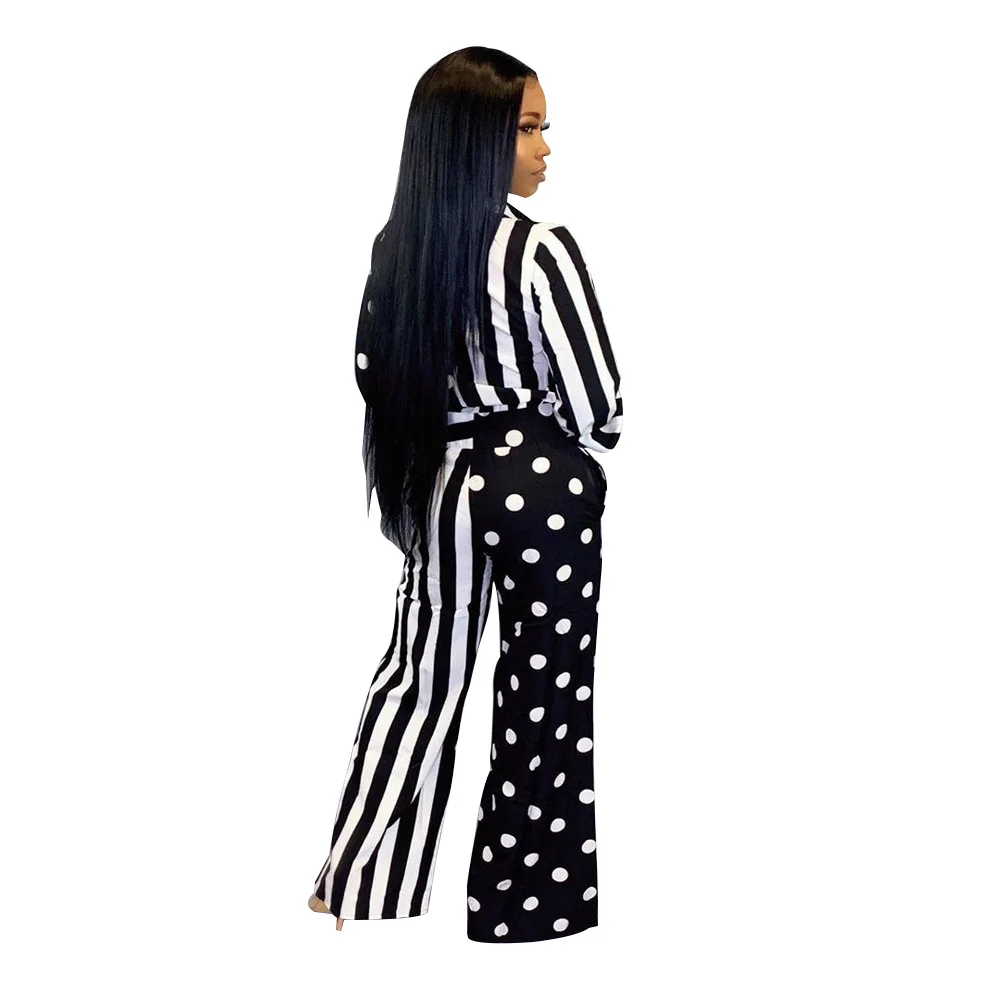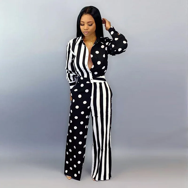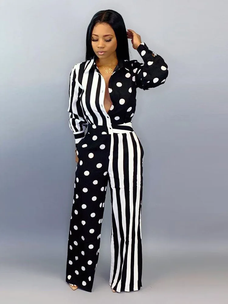 | Elegant Dot And Striped Jumpsuit Color Patchwork Playsuits With Button Long Wide Pants Autumn Rompers Womens Jumpsuit Overalls |