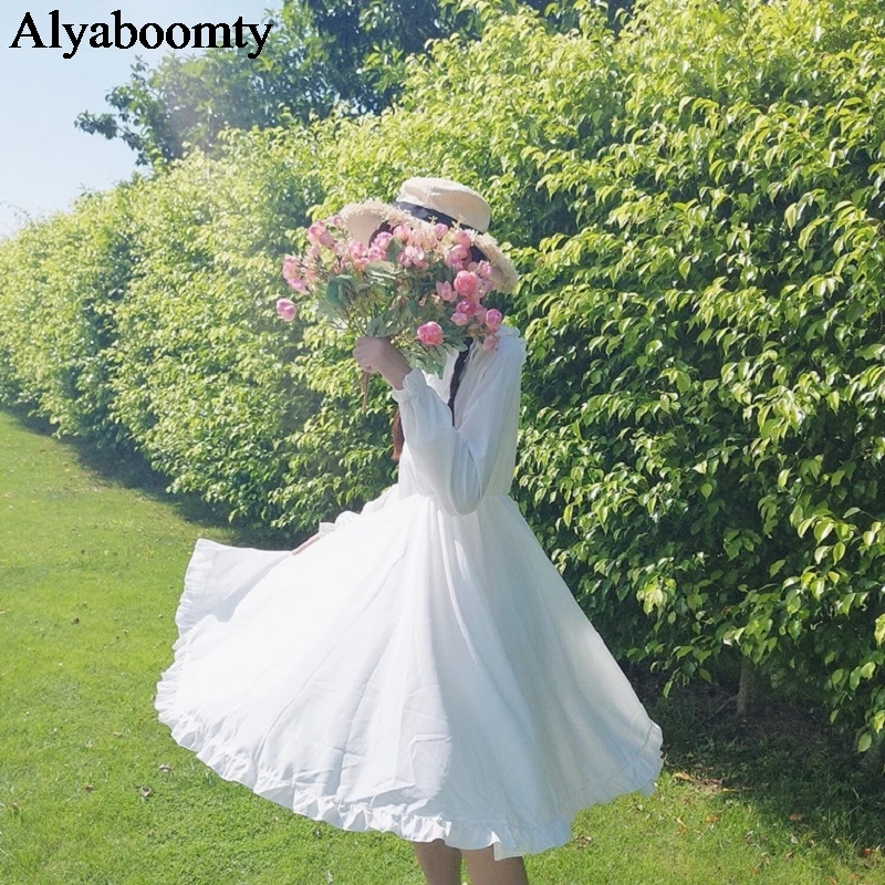| Japanese Summer Lolita Style White Purple Dress Peter Pan Collar High Waist Princess Fairy Dress Cute Kawaii Girl Ruffles Dress |