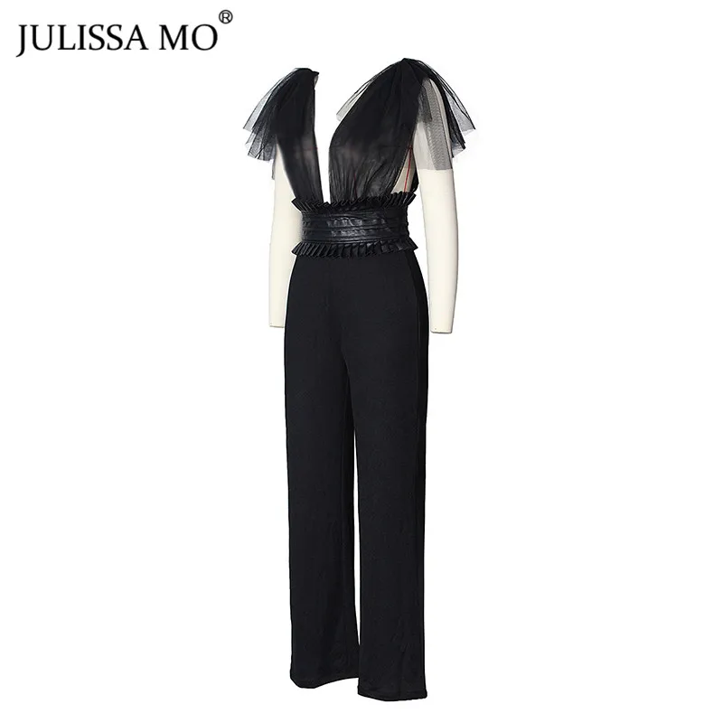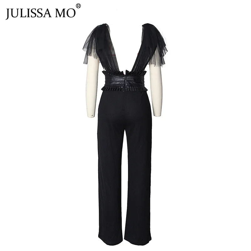 JULISSA MO Elegant V Neck Mesh Sleeve Jumpsuit Women 2019 Autumn PU Belts Sexy Wide Legs Jumpsuits White Office Ladies Overalls