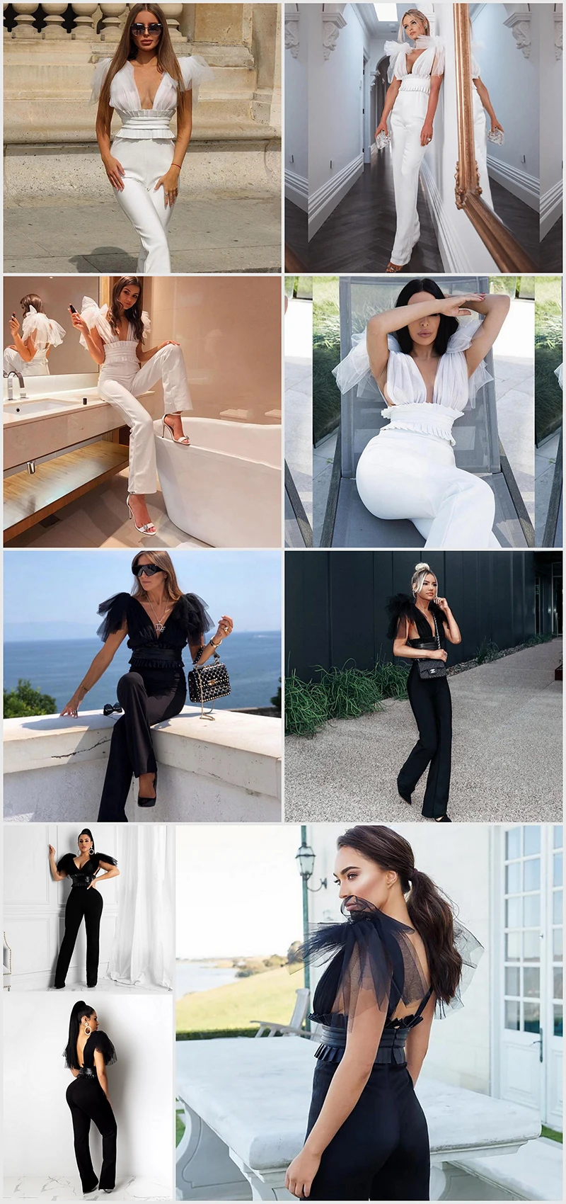Best Price Comparison With JULISSA MO Elegant V Neck Mesh Sleeve Jumpsuit Women 2019 Autumn PU Belts Sexy Wide Legs Jumpsuits White Office Ladies Overalls
