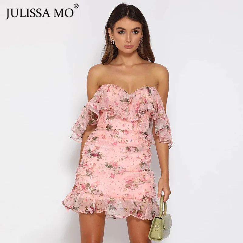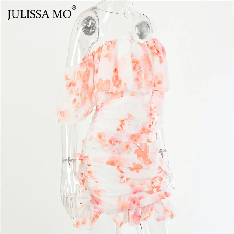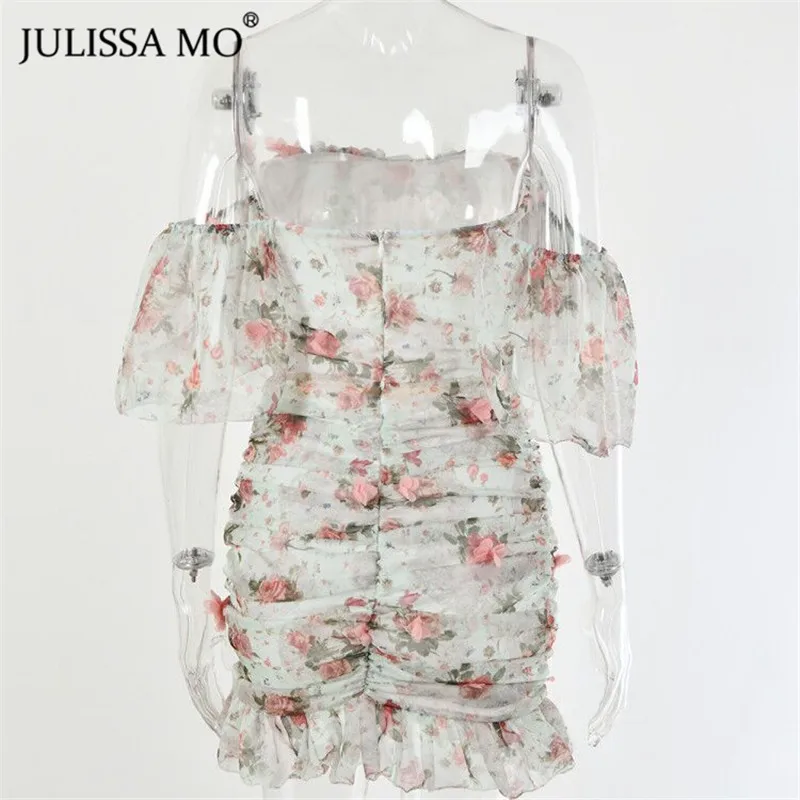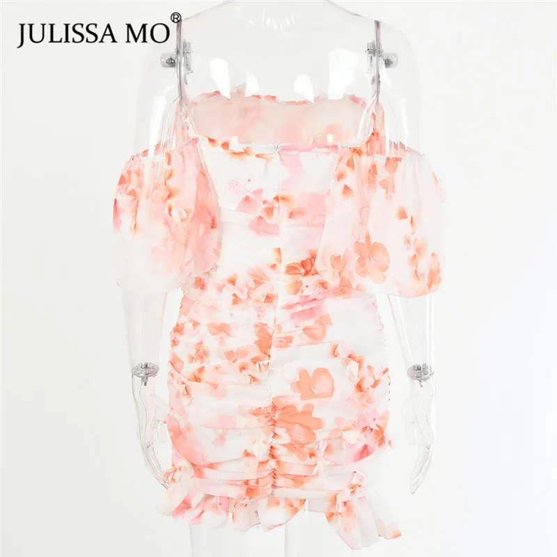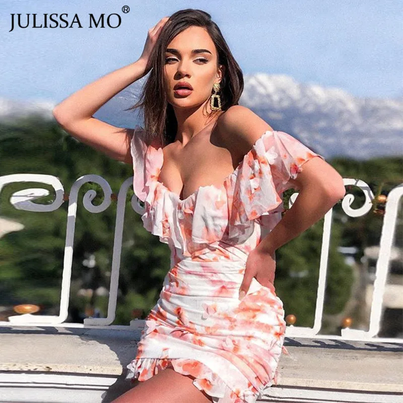 JULISSA MO Sexy Off Shoulder Floral Print Dress Women Ruffles Sleeve Bodycon Short Dress Elegant Female Backless Party Vestidos
