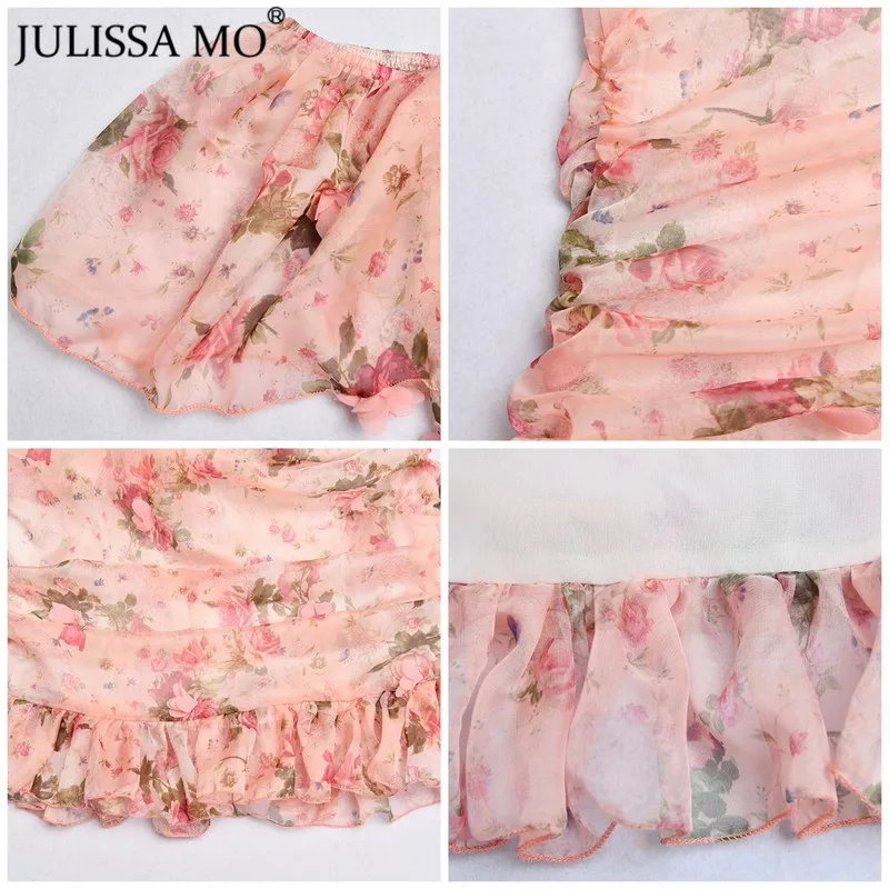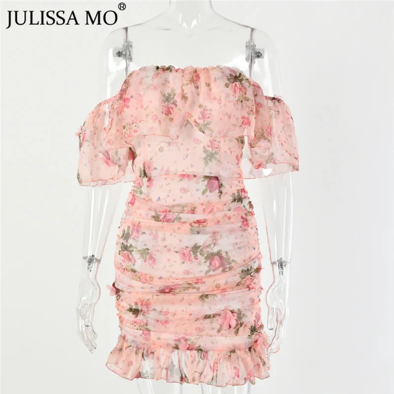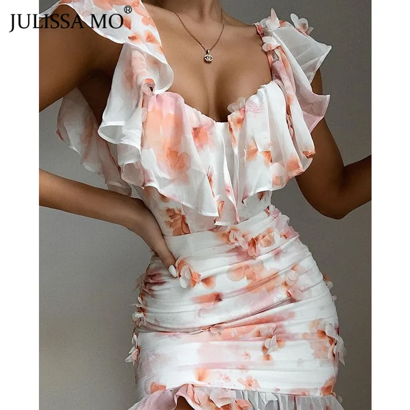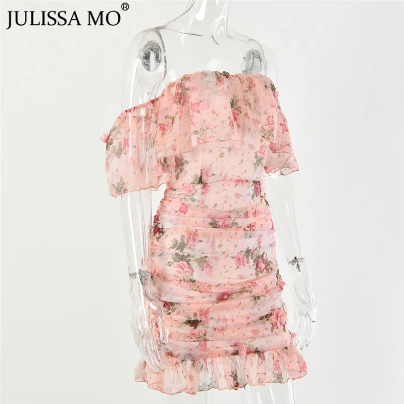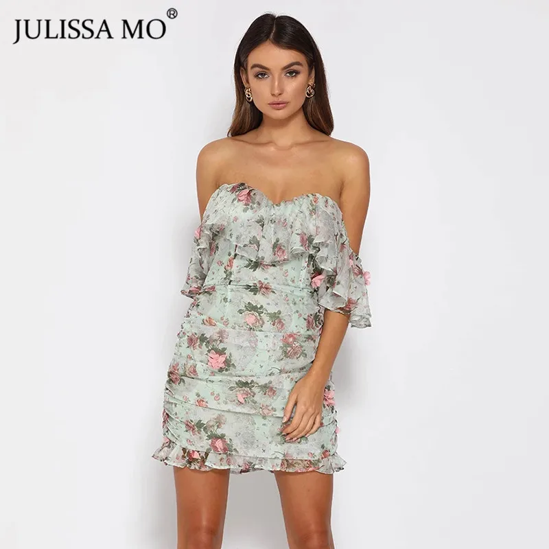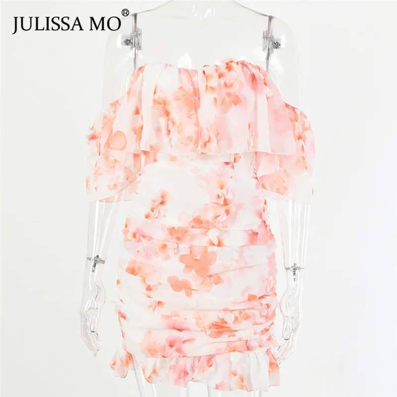 JULISSA MO Sexy Off Shoulder Floral Print Dress Women Ruffles Sleeve Bodycon Short Dress Elegant Female Backless Party Vestidos