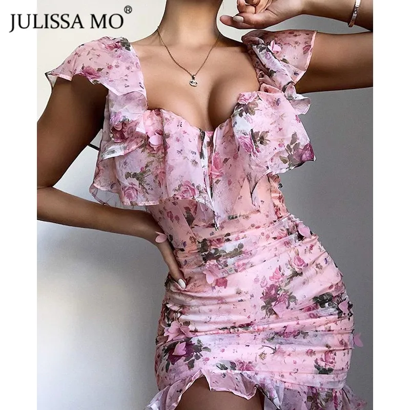 | JULISSA MO Sexy Off Shoulder Floral Print Dress Women Ruffles Sleeve Bodycon Short Dress Elegant Female Backless Party Vestidos |
