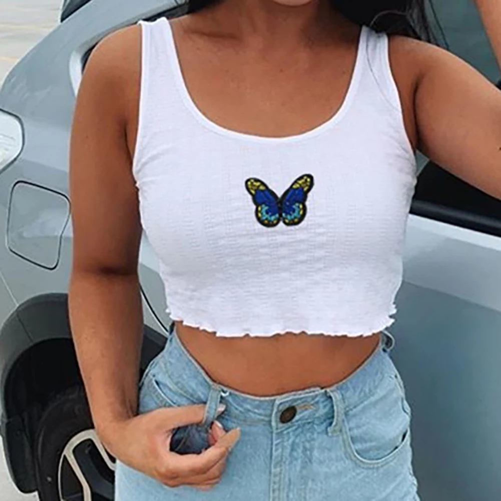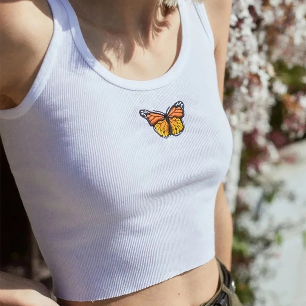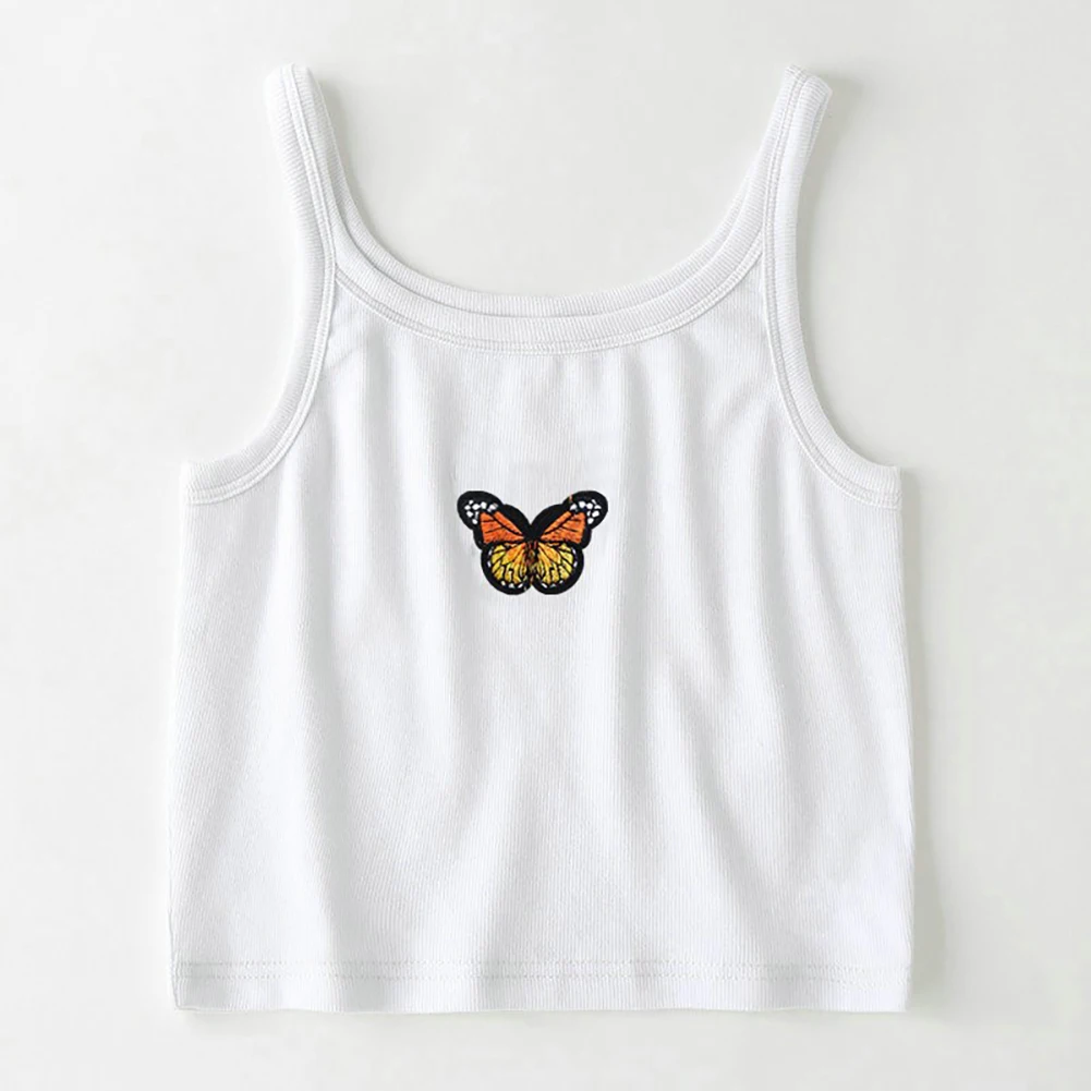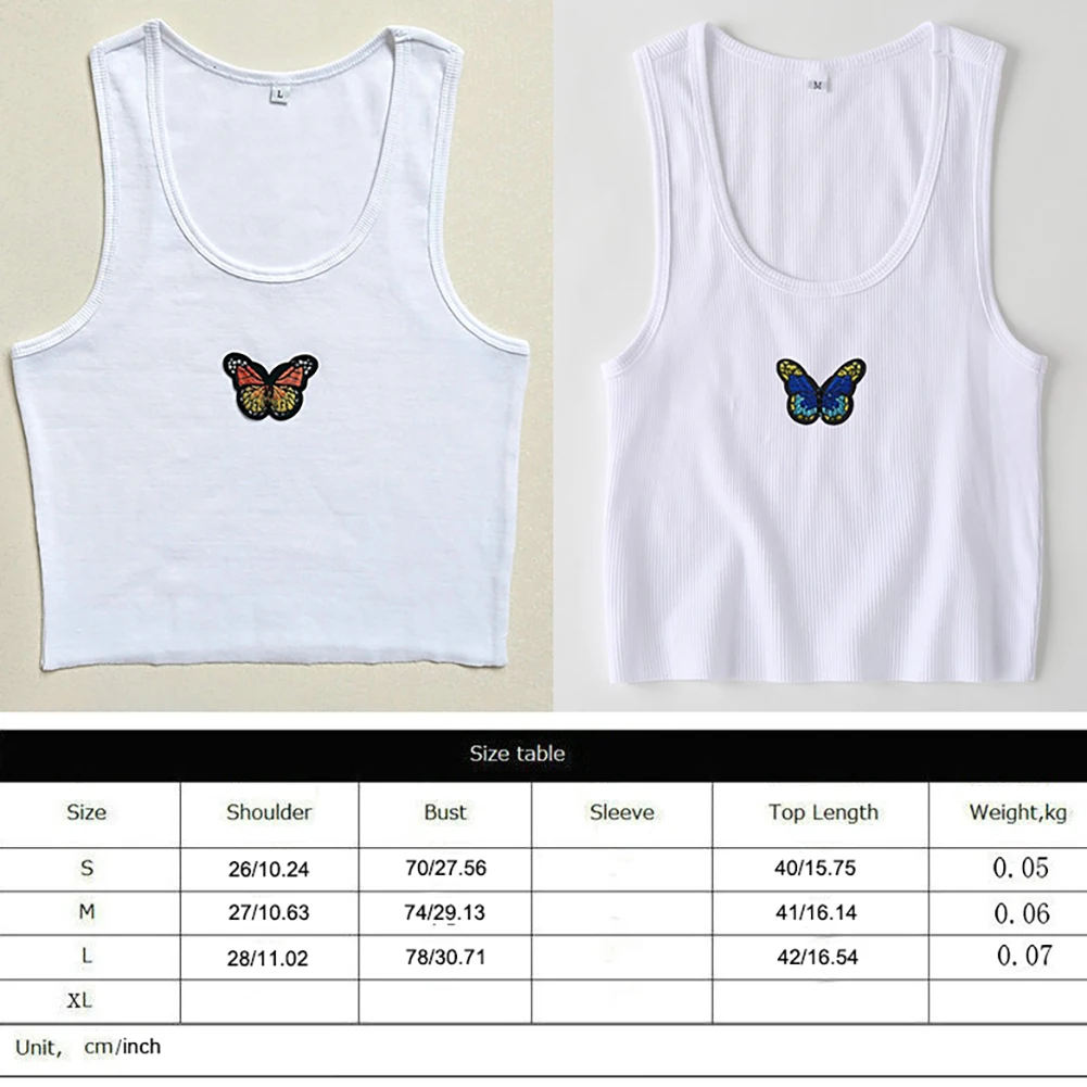 | Summer Vest Tank Pure Color Halter Crop Tops Casual Sexy Butterfly Embroidered Short Slim Sleeveless White Tops |