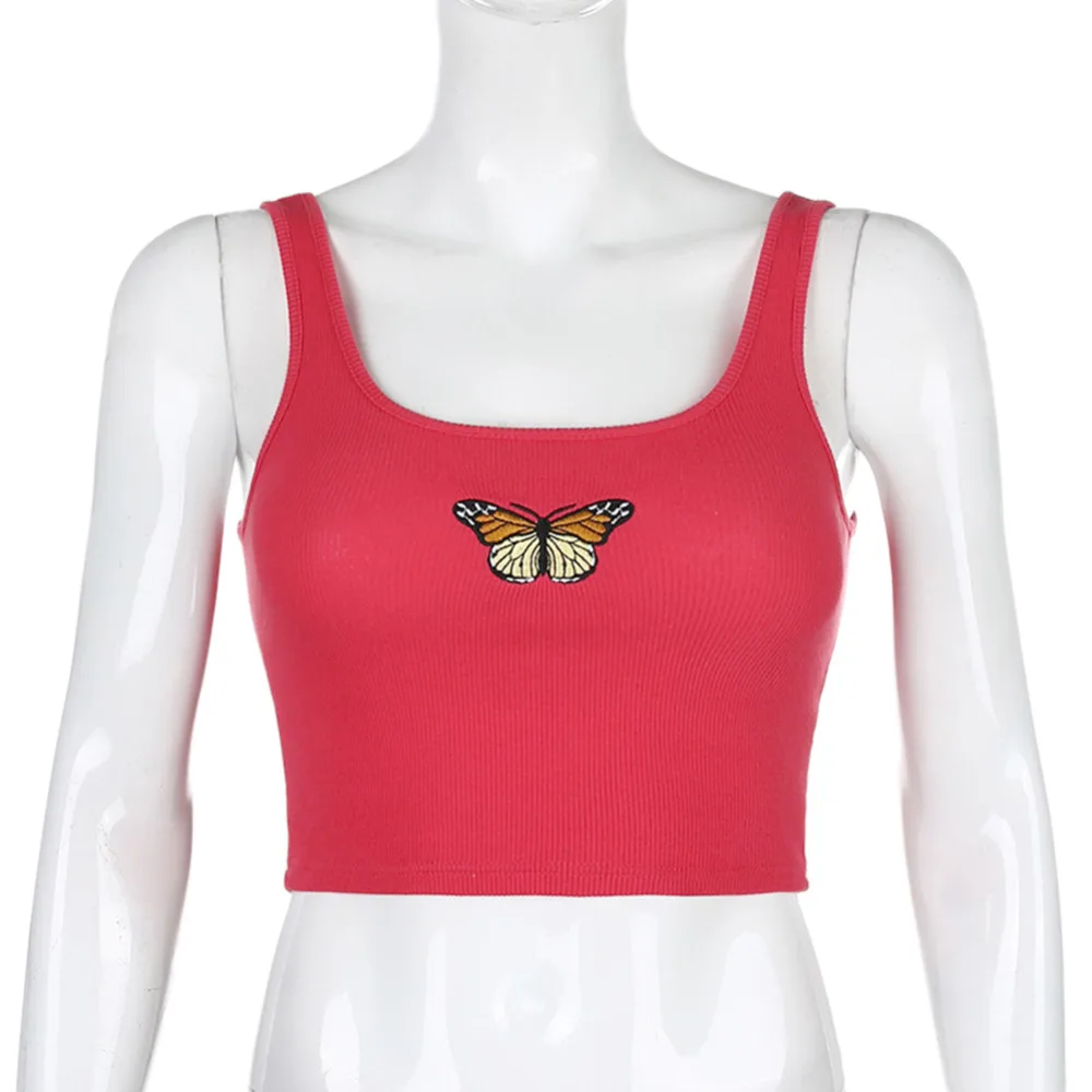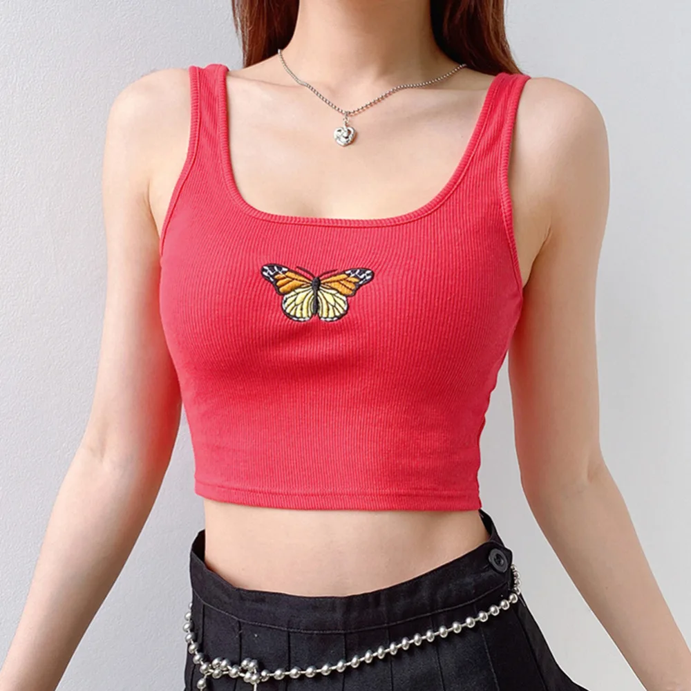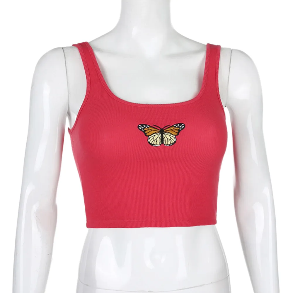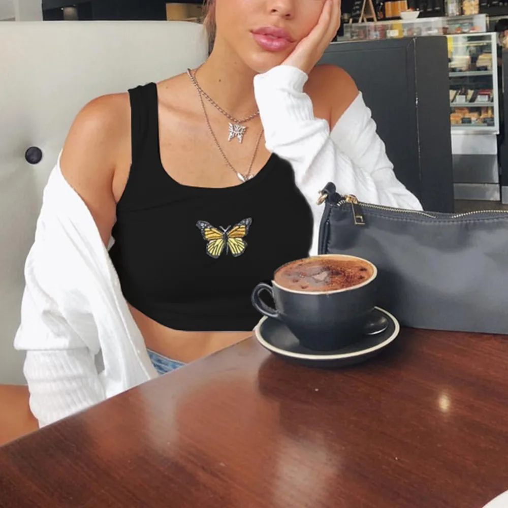 | Summer Vest Tank Pure Color Halter Crop Tops Casual Sexy Butterfly Embroidered Short Slim Sleeveless White Tops |
