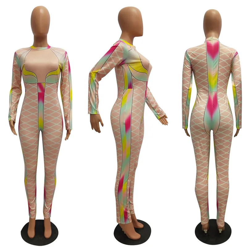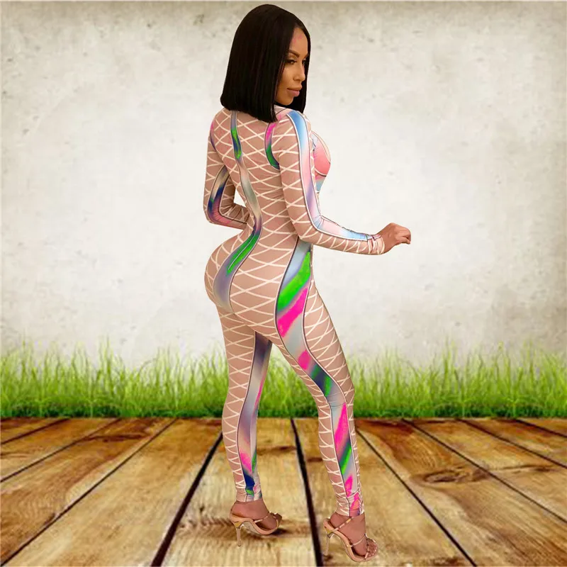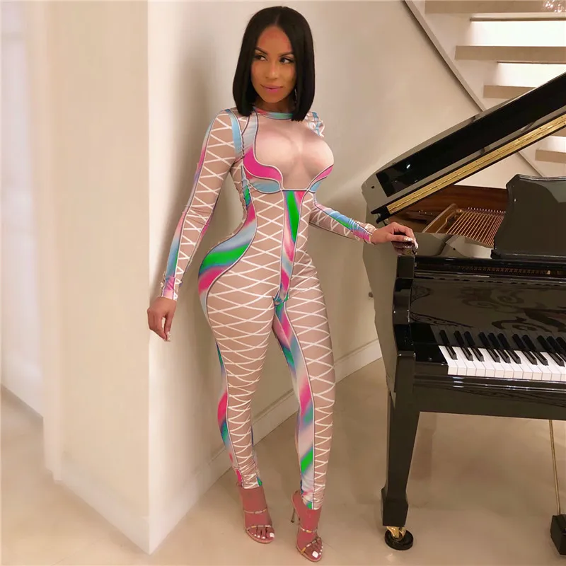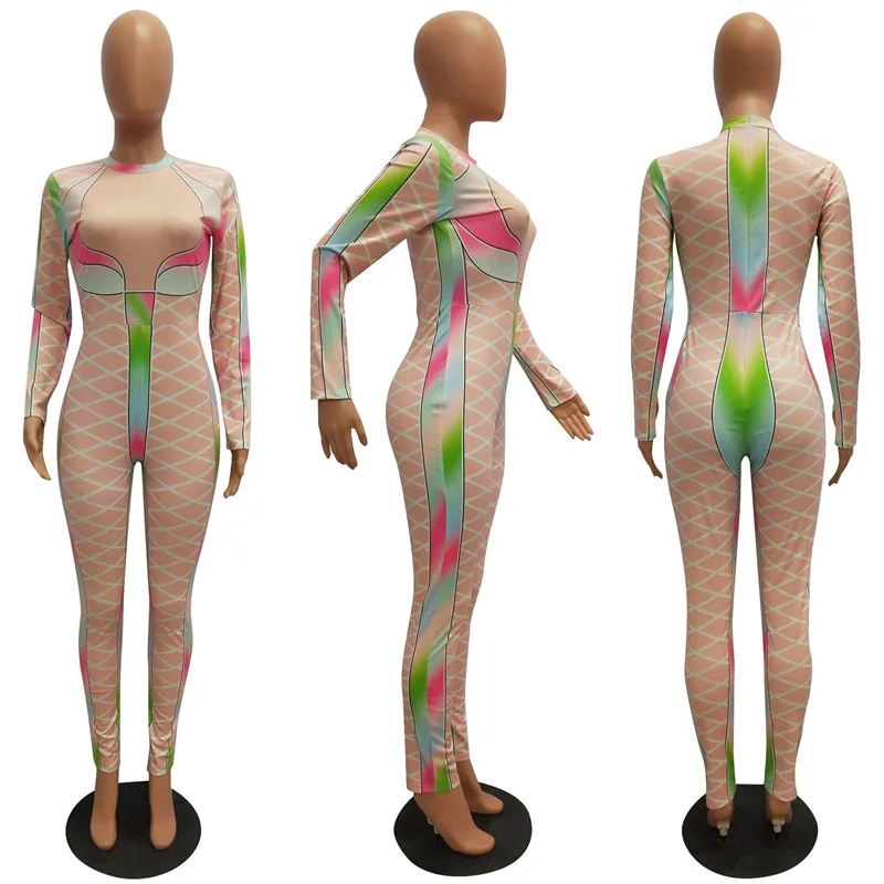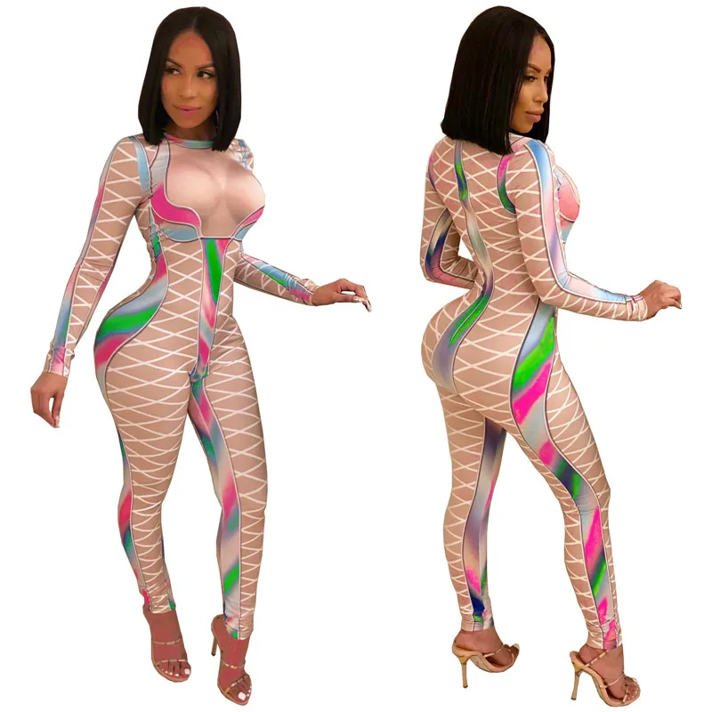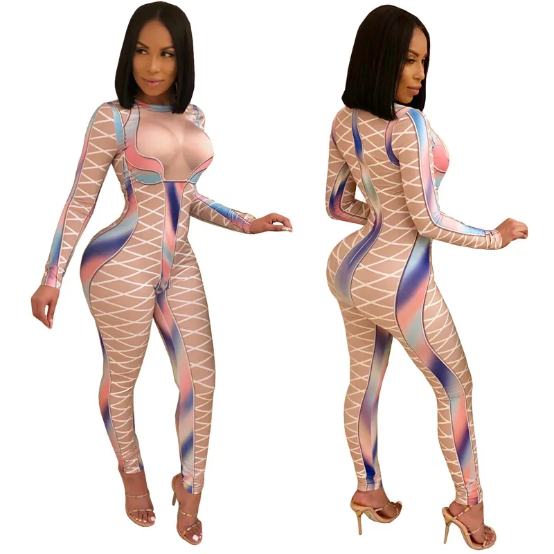 | U Women Sexy Bodycon Jumpsuits Multicolor Block Cross Line Print O-Neck Slim Long Pencil Pants Party Club Curvaceous Lady Romper |