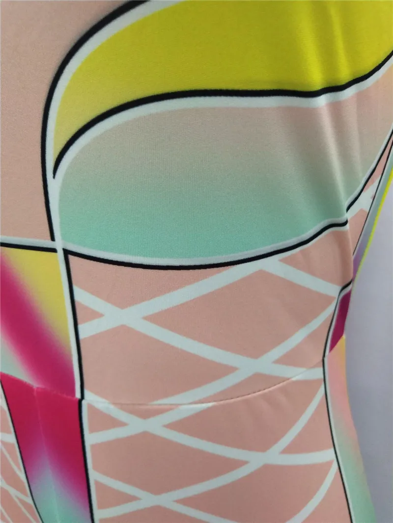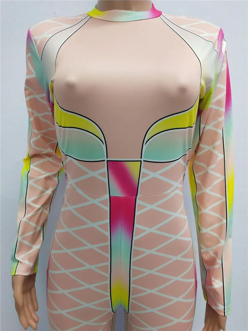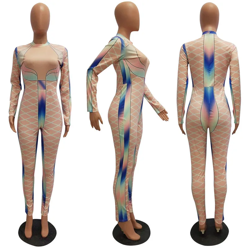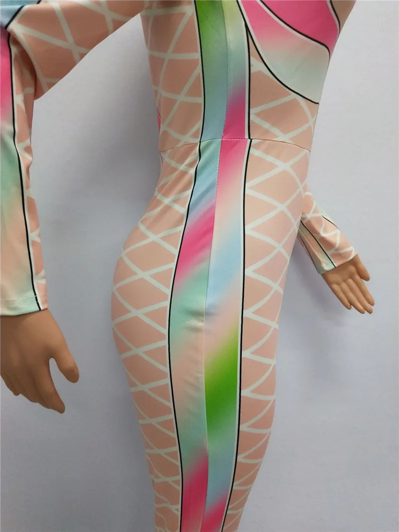 | U Women Sexy Bodycon Jumpsuits Multicolor Block Cross Line Print O-Neck Slim Long Pencil Pants Party Club Curvaceous Lady Romper |